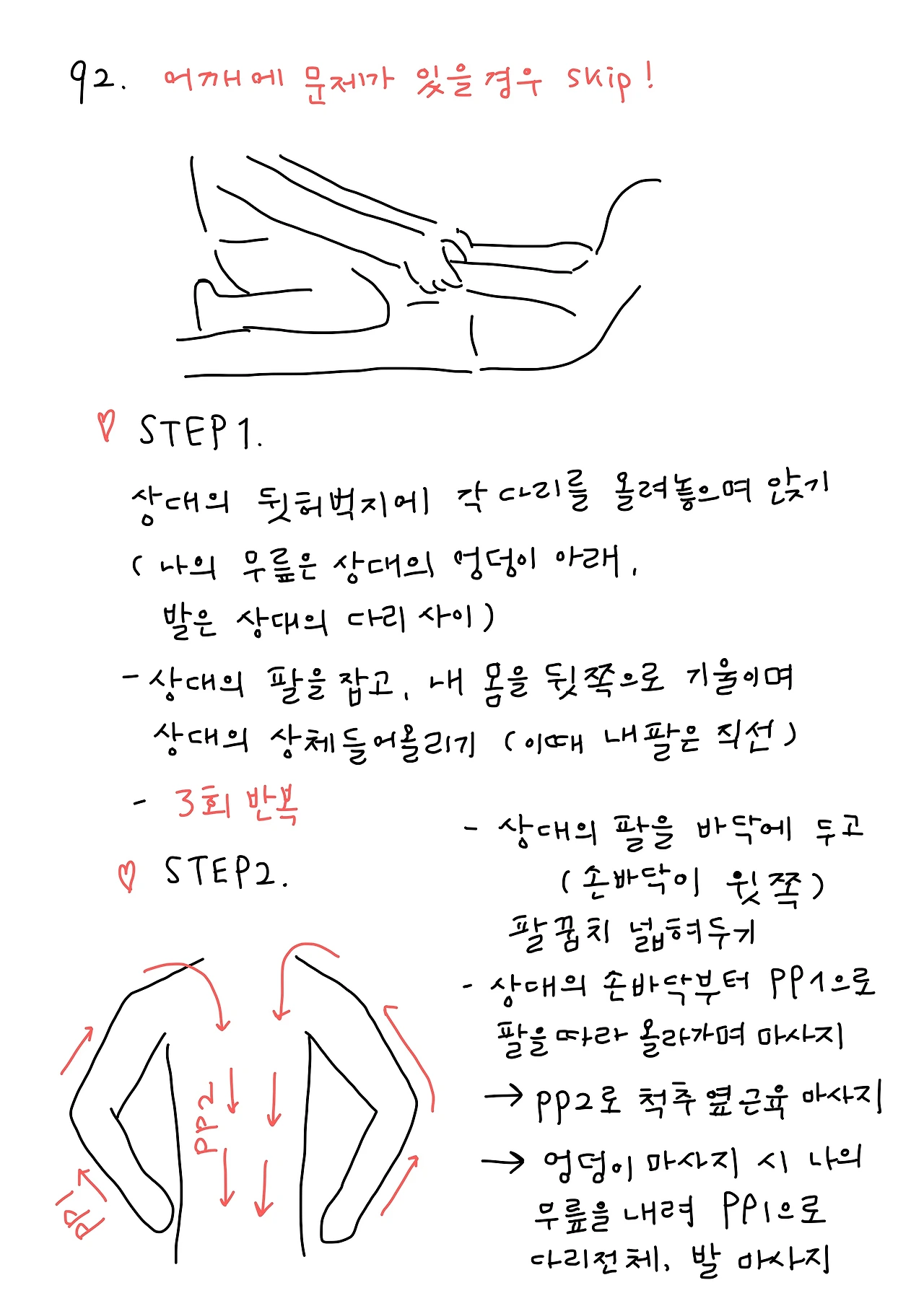다음으로 상대의 팔을 바닥에 두고(손바닥이 위쪽) 상대의 손바닥에서부터 나의 손바닥으로 팔을 따라 올라가며 마사지한다. 그리고 조금 더 강하게 척추 옆 근육을 마사지하고 엉덩이 마사지 시 나의 무릎을 내려 다시 손바닥 전체로 다리 전체, 발을 마사지한다.