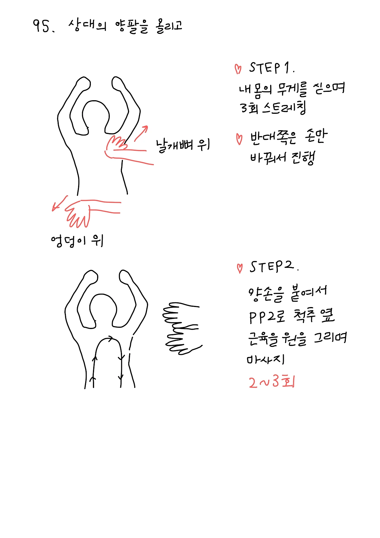 상대의 양팔을 올리고, 나는 상대의 엉덩이 위와 날개뼈 위에 손바닥을 열어서 붙인다.