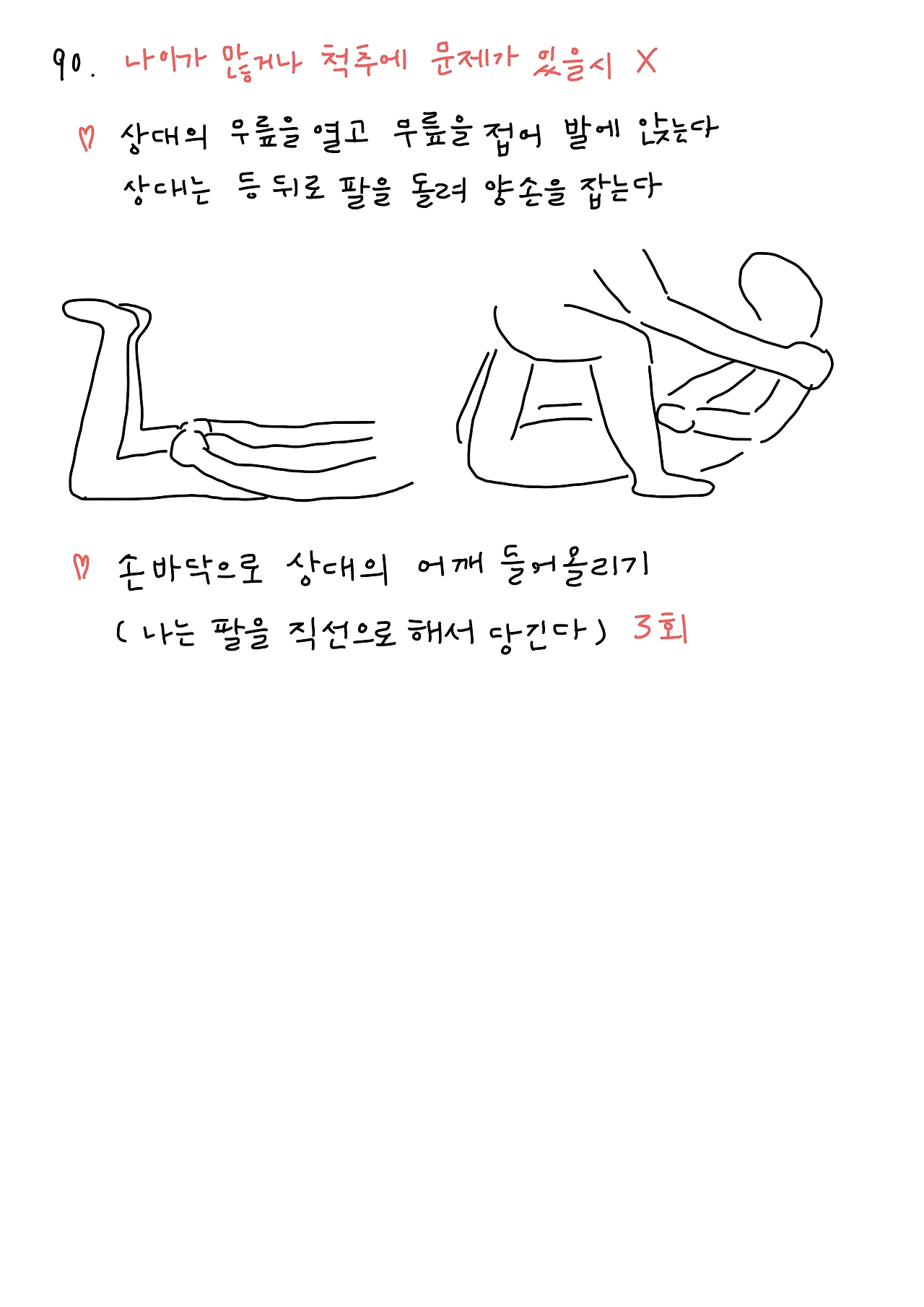 다음 과정은 나이가 많거나, 척추에 문제가 있을 시에는 시행하지 않는 마사지법이다.