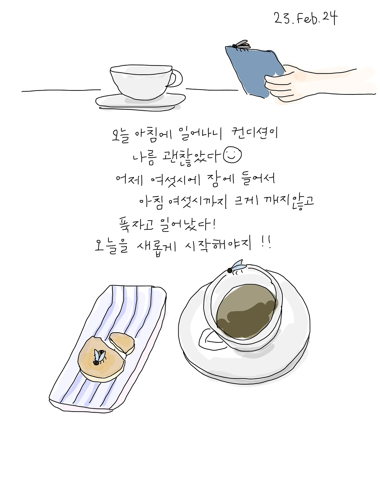 가끔은 푹 쉬어줘야 하는 나의 몸. 시원하게 비가 내린 뒤에 맑게 개인 기분으로 하루를 시작했다. 아침엔 여느 때와 다름없이 독일친구와 함께 카페에 갔다. 우리의 모닝루틴. 처음 간 카페에 마주 앉아 커피를 마셨다. 나는 그림을 그렸고, 그는 무언가를 열심히 적었다.