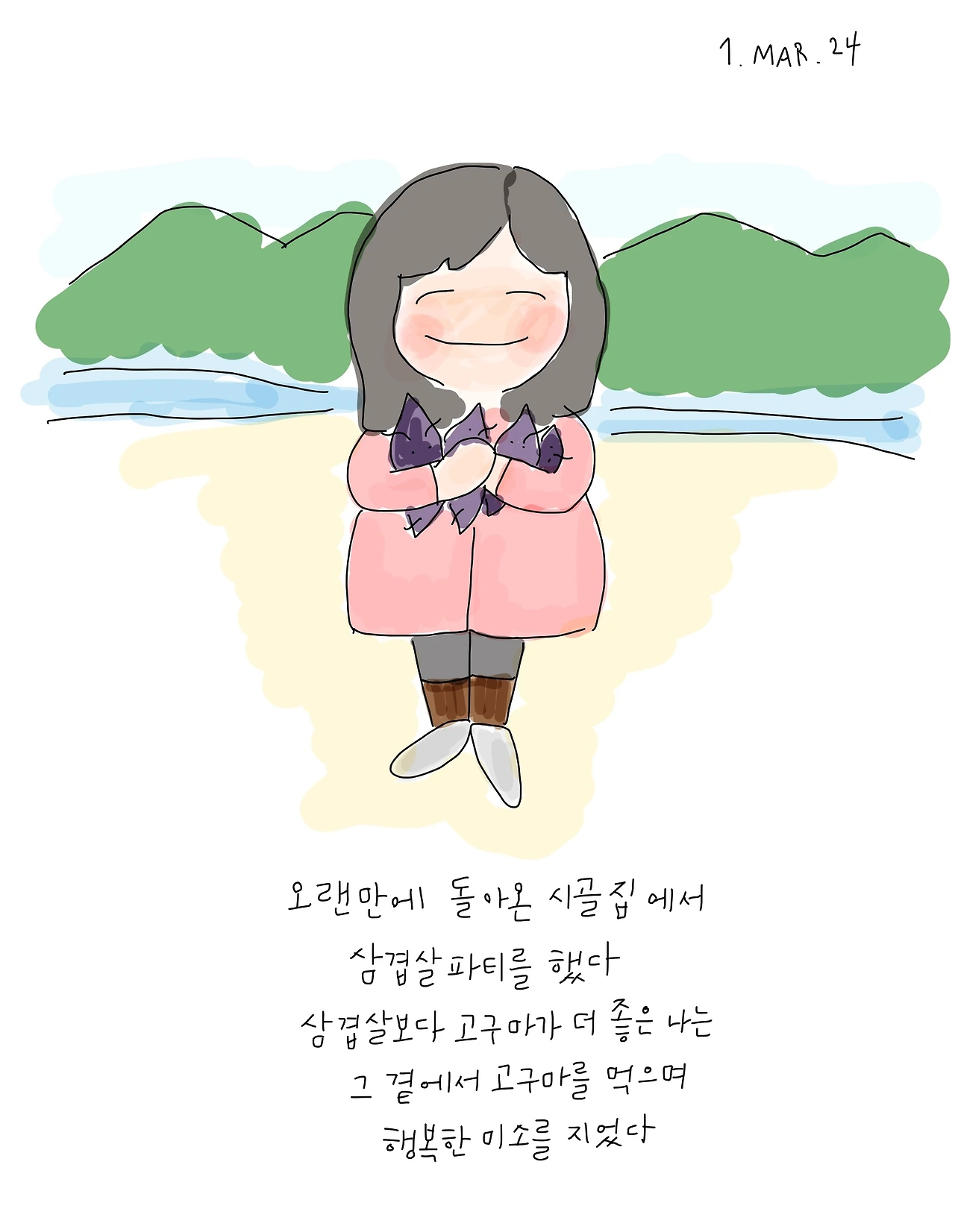 다음날, 동생과 청주에 있는 부모님 댁으로 향했고 시외버스터미널에서 오랜만에 한국 김밥을 먹었다. 뭔가 감개무량할 것 같았는데 의외로 덤덤했다. 그렇게 부모님 댁에 도착한 지 얼마 되지 않아 우리는 보은에 있는 시골집으로 향했다. 언니 내외도 저녁에 와서 함께 밥을 먹었다. 왁자지껄한 것이 정말 집에 온 것 같은 기분이었다. 하지만 여전히 뭔가 허전한 기분이 들었다. 그것은 아마도 ‘타마’(나의 반려견) 없이 온 것은 처음이라 그랬을까.