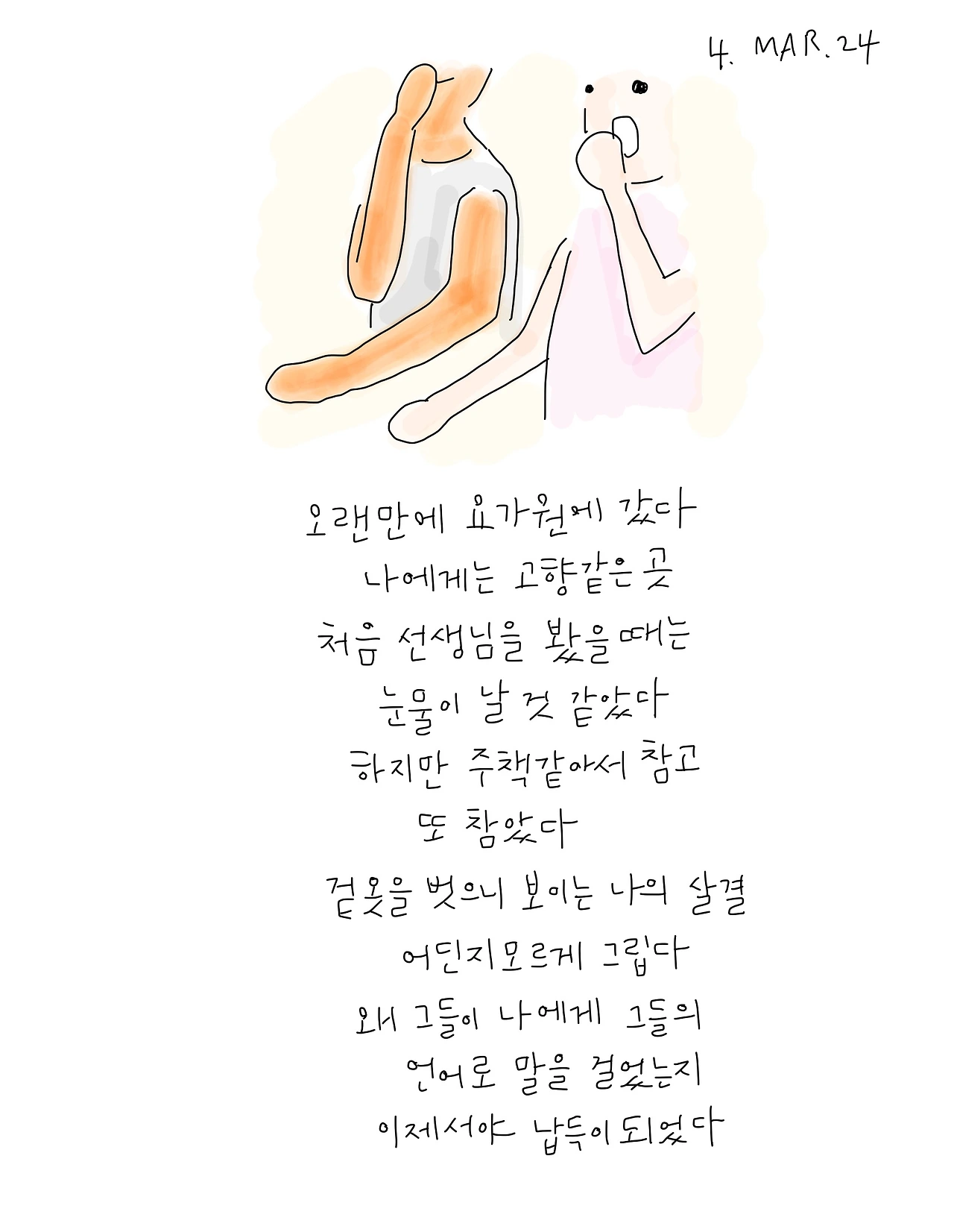 월요일 아침이 되자, 나는 병원에 들러 간단한 검진을 마치고, 요가원에 갔다. 오랜만에 들어선 요가원에서 마주한 선생님을 보고 눈물이 울컥 날 것 같았지만 어른스럽게 잘 참아냈다. 그렇게 한국에 있었던 한 달도 안 되는 시간 동안 요가원에 가서 수업을 들었다. 그중 일주일은 동생의 서울 집에서 지내느라 정작 다닌 것은 일주일이 조금 넘는 시간이었지만 다른 어떤 곳보다 더 나에게 위안을 주는 공간이었다.