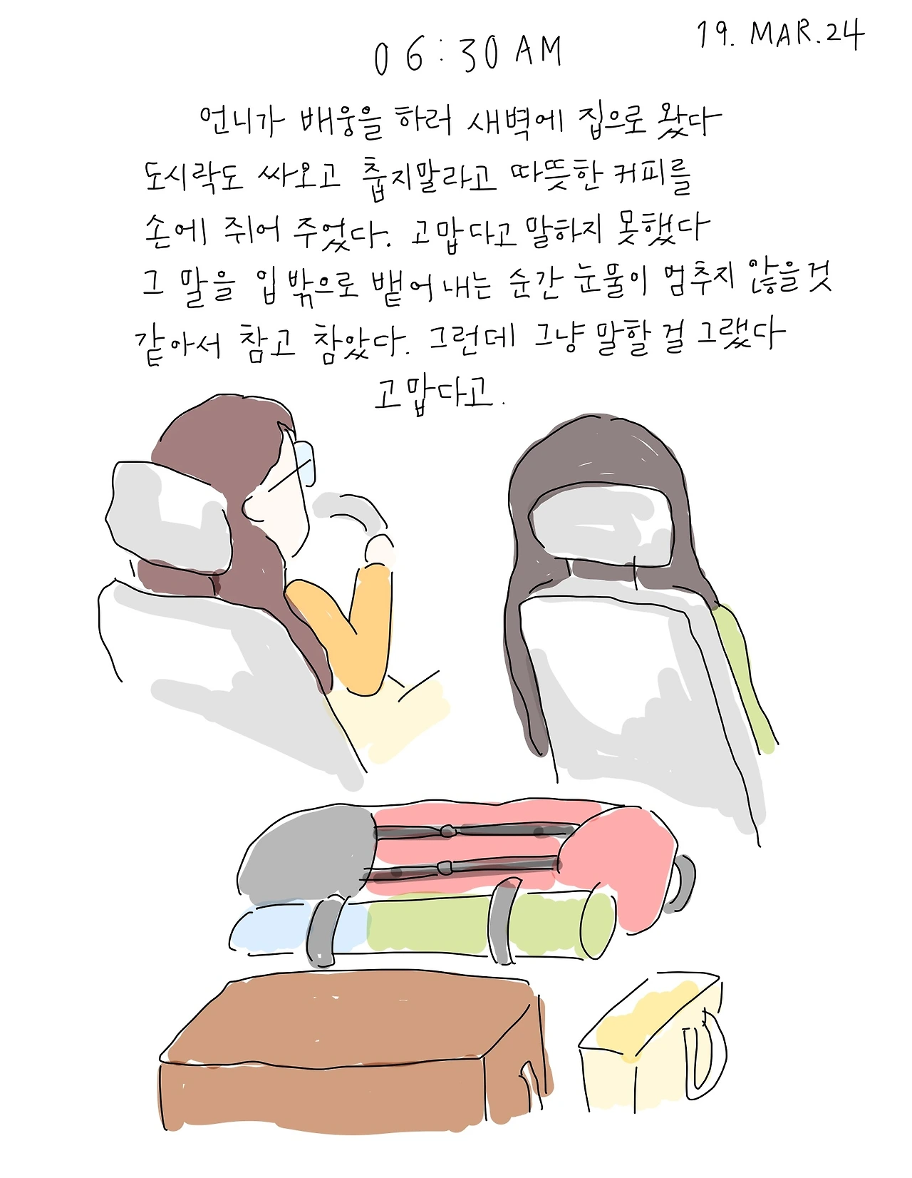 다음 날, 공항까지 데려다주겠다는 언니에게 한사코 괜찮다고 사양했다. 얼마나 먼 길일줄 알기에. 나도 그 편이 마음이 편했다. 대신 언니는 집에서 버스터미널까지 데려다준다며 새벽에 찾아왔다. 떠나는 나에게 핫팩과 도시락을 건네주었다. 누군가에게 처음 받아보는 도시락. 언니가 잠시 커피를 사러 간 사이에 눈물이 앞을 가렸다. 마지막 모습은 울고 싶지 않아서, 부랴부랴 눈물을 훔쳤다. 고맙다는 말이 목 끝까지 차올랐다. 하지만 그 말을 차마 할 수 없었다. 그 말을 뱉어버리면 눈물이 왈칵 쏟아져서 떠날 수가 없을 것 같았다. 눈물을 눌러 담 듯 그 말을 꾹꾹 눌렀다.