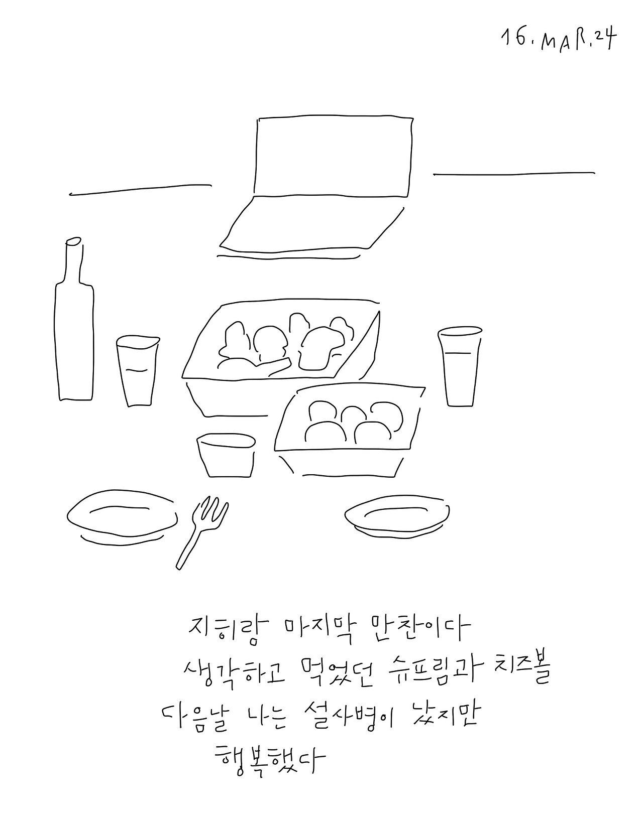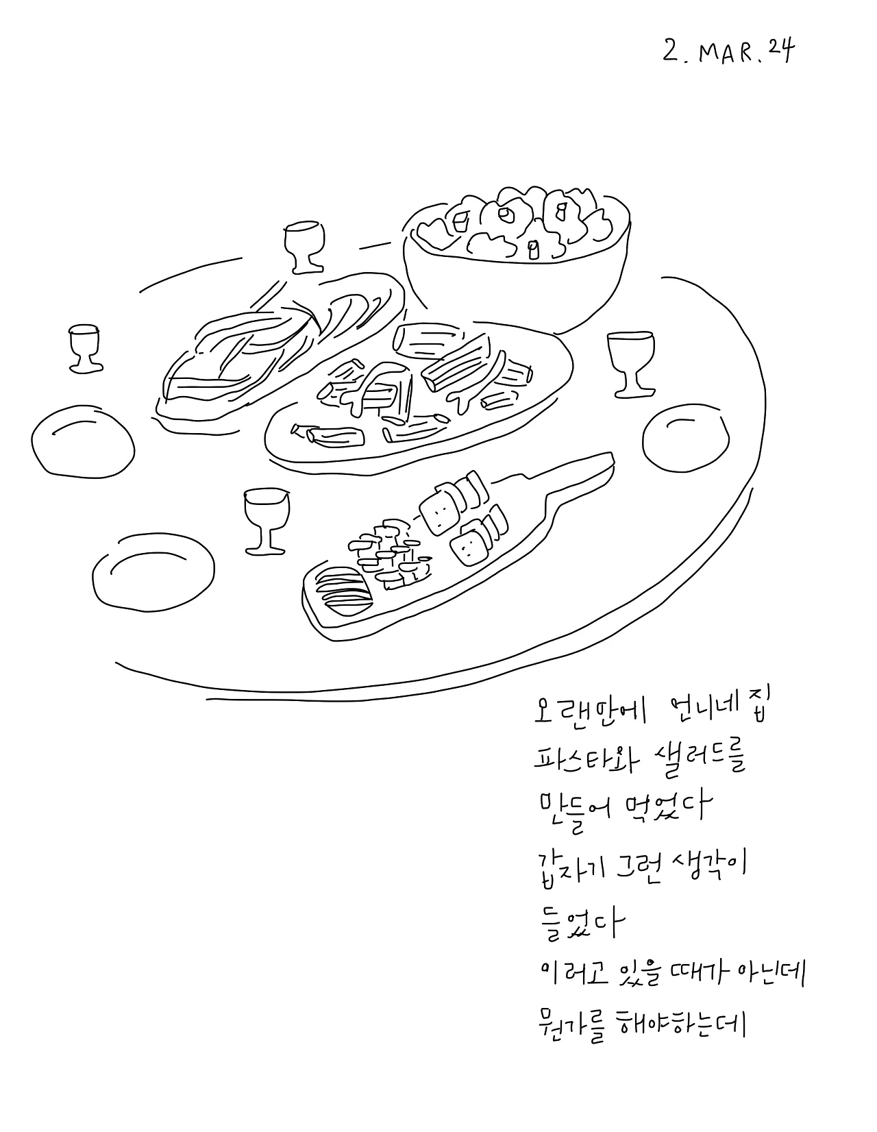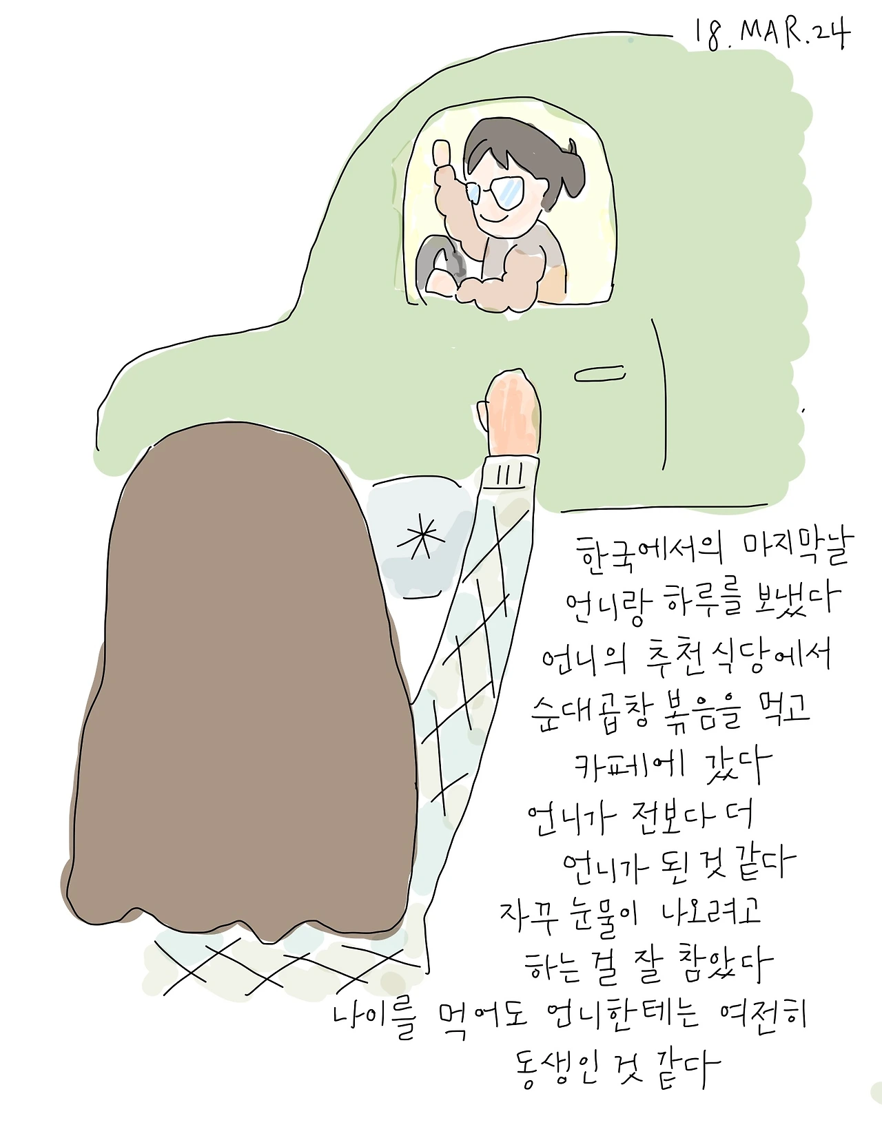 버스가 출발하고 담아두었던 눈물이 쏟아졌다. 도착한 첫날부터 동생과 지냈던 시간들, 시골집에서 다 같이 왁자지껄 떠들며 먹던 저녁, 오랜만에 요가원에서 만난 언니들, 도어록을 누르며 들어오던 엄마와 아빠를 기다리던 저녁, 언니와 보낸 마지막 날까지. 받고만 온 것 같아서 미안한 마음이 들었다. 공항에 도착해서 비행기를 기다리며 언니가 싸준 도시락을 열었다. 내가 좋아하는 것들이 들어있었다. 분명 내가 뭘 좋아하는지 아는 사람이었다. 그때 그냥 말할 걸 그랬다. 고맙다고.