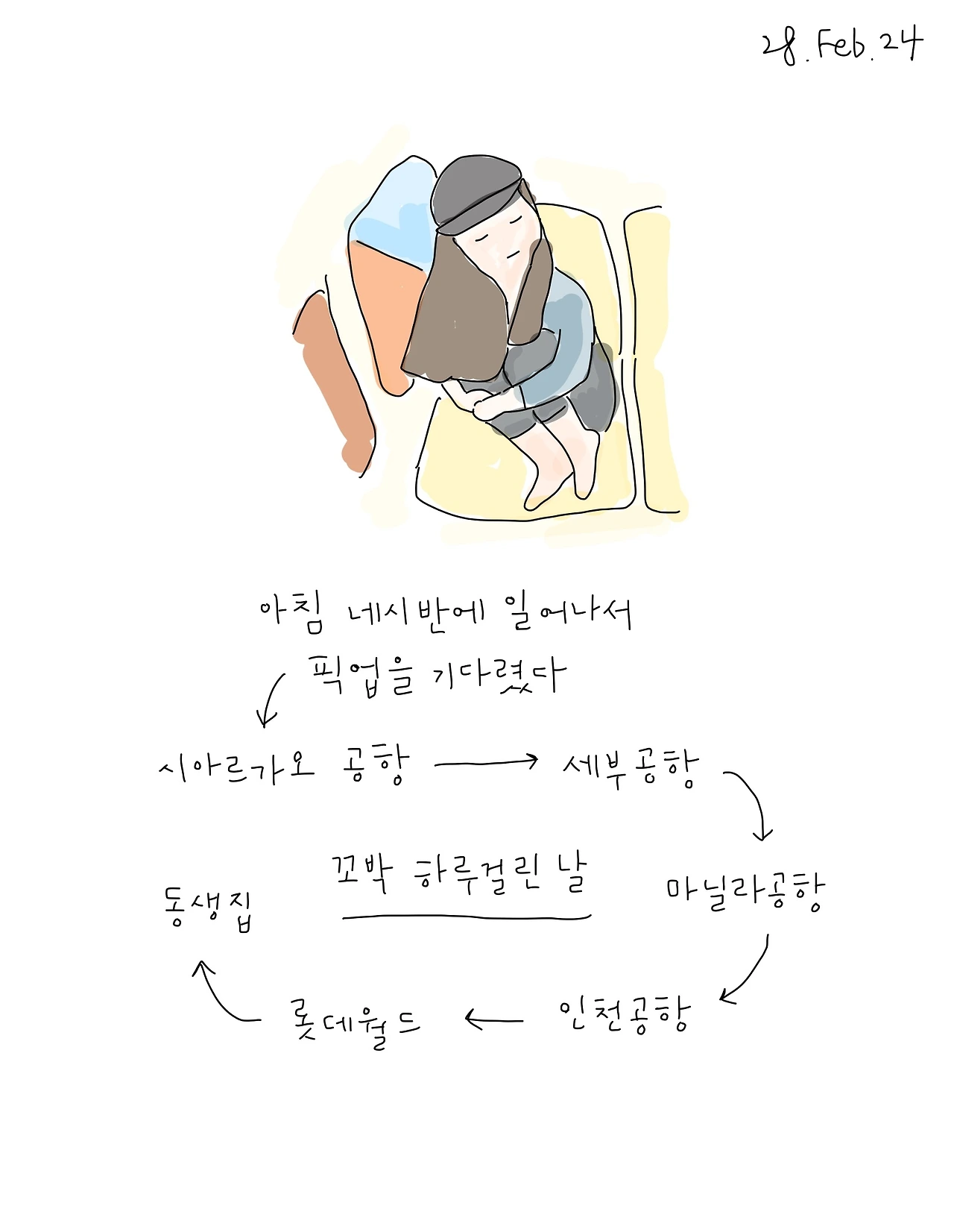 필리핀 시아르가오에서 인천공항까지 가는 여정은 이러했다. 숙소에서 새벽 4시 반에 공항으로 향하는 밴을 타고 시아르가오 공항에 도착, 그 후 세부공항에서 마닐라 공항, 마닐라에서 인천. 하루를 온전히 다 보내고 나는 밤 11시에 인천 공항에 도착했다. 사실 청주에 있는 부모님 댁으로 바로 향할까 생각도 했지만, 그 시각에는 시외버스도 없었고, 서울에 막 취업을 해서 자취를 하고 있는 막내 동생의 집으로 갈 참이었다. 새벽 버스가 있을 줄은 상상도 못 한 채 동생에게 다음날 아침 일찍 갈 것이라 말해두었지만 공항을 빠져나와 바로 보이는 것은 서울 시내로 들어가는 심야버스. 그것도 5분 뒤에 버스 한 대가 있었다.