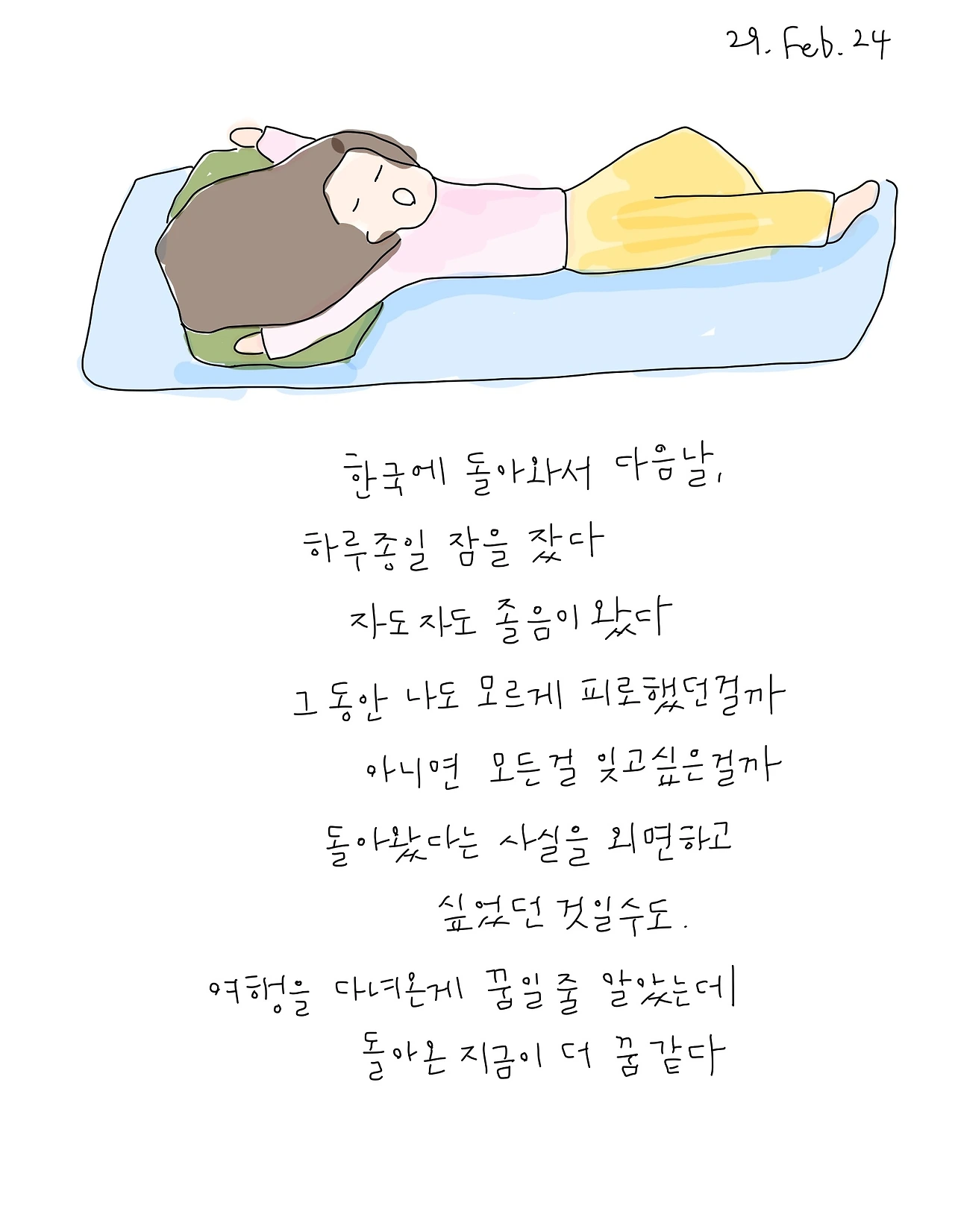 한국에서의 첫 아침. 동생은 출근을 하고 나는 집에 혼자 남겨졌다. 12층. 회색빛의 하늘 아래로 두꺼운 옷을 입은 사람들이 분주히 움직이고 있었다. 지난날들과의 완벽한 대비에 잠시 주춤했다. 무언가를 하고 싶다는 마음이 전혀 들지 않았다. 침대 안으로 더 웅크리고 들어가 누웠다. 그렇게 나의 첫날은 동생이 올 때까지 침대 위에서 잠을 청했던 것 같다.