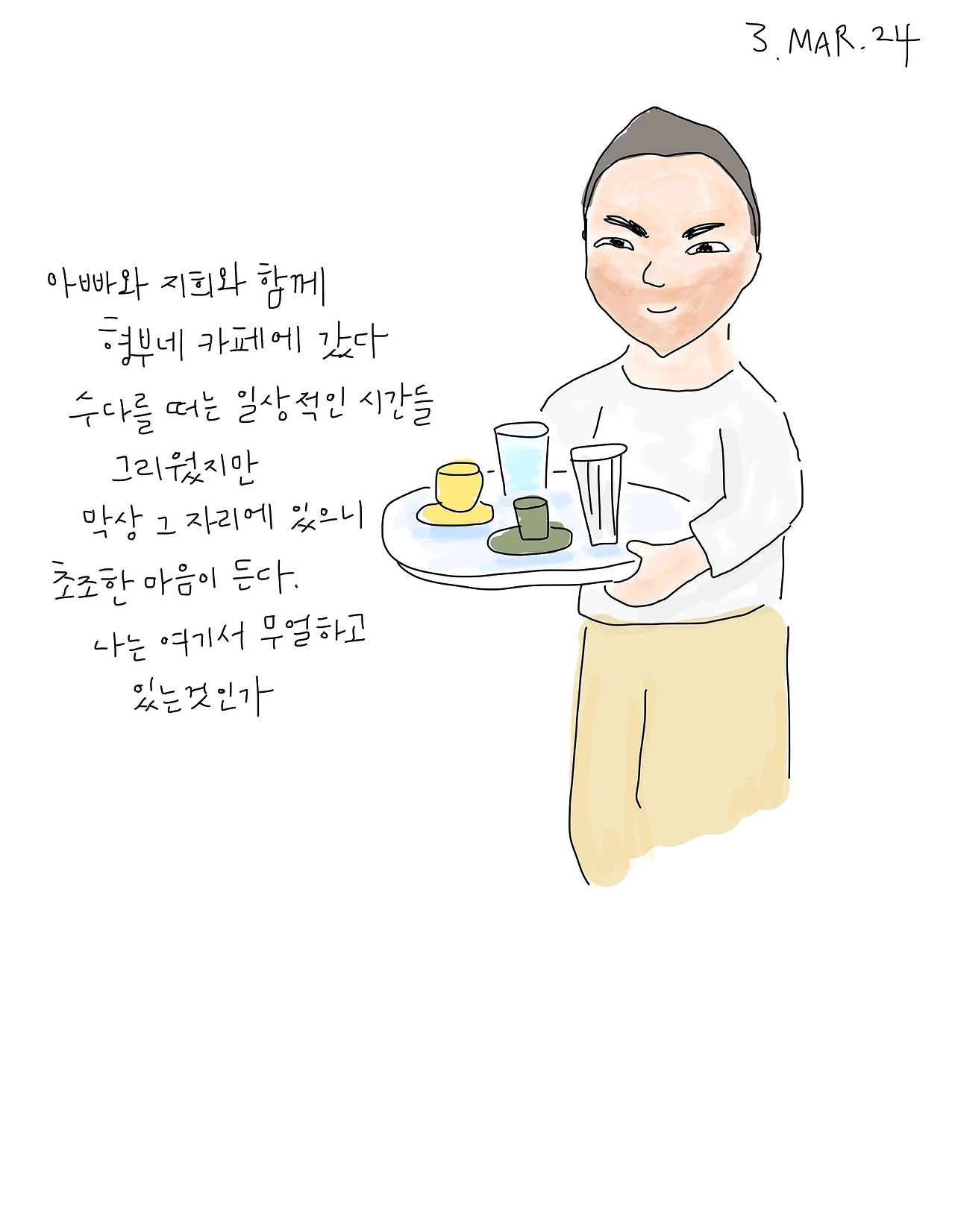 청주집으로 돌아와 떠나기 전에 이런저런 일을 해결하고 싶었지만 나에게 주어진 것은 단 하루. 그날 아침에 언니에게 연락이 왔다. 오늘 뭐 할 거냐고 물었고, 언니와 시간을 보내기로 했다. 은행도 가고 핸드폰 대리점도 갔다가, 주민센터도 가고, 경찰서에도 갔다. 사실 이곳저곳 간 것치고는 해결된 일은 없지만, 아무렴 어떠냐 싶었다. 언니와 점심을 먹고, 나의 단골 카페에 갔다가 집으로 돌아왔다.