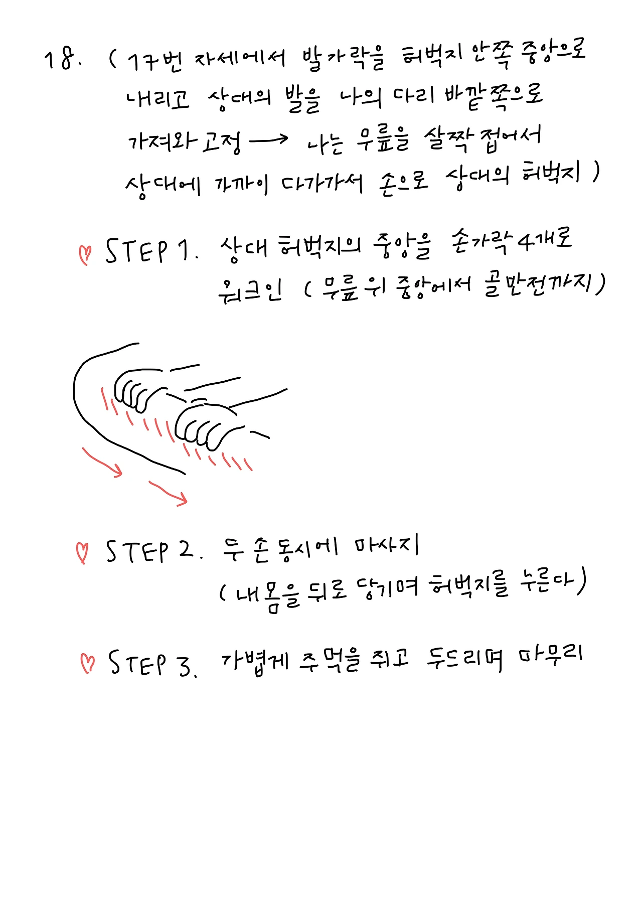이후에 조금 더 강하게 나의 양 무릎을 펼친 상태로 상대의 다리를 끌어당기듯이 허벅지 안쪽을 압박하며 마사지한다.
