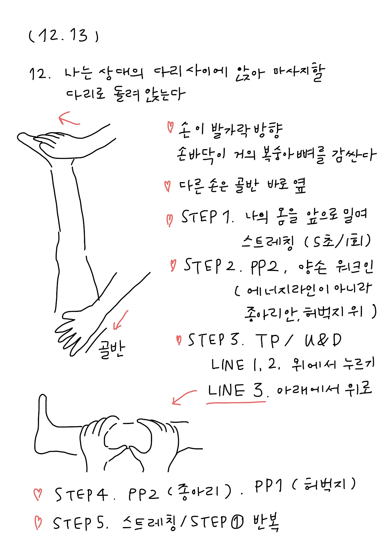 나의 손가락이 발가락방향을 향하며 손바닥이 거의 복숭아 뼈를 감싸 쥔다. 다른 손은 상대의 골반 바로 옆을 짚고 나의 몸을 앞으로 밀며 스트레칭을 5초간 한다. 다음은 양손으로 에너지라인은 신경 쓰지 않고 종아리안과 허벅지 위를 따라 무릎 쪽으로 마사지하며 움직인다.