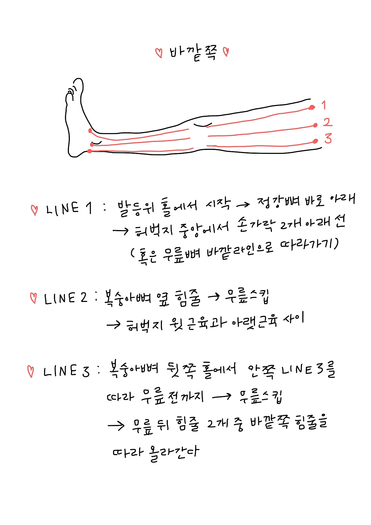 라인 2는 복숭아뼈 옆 힘줄에서 무릎은 건너뛰고 허벅지 윗 근육과 아랫근육 사이이다.
