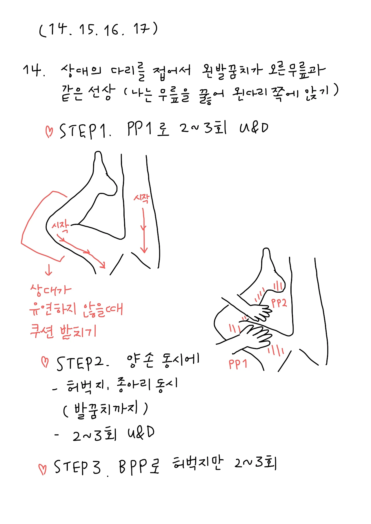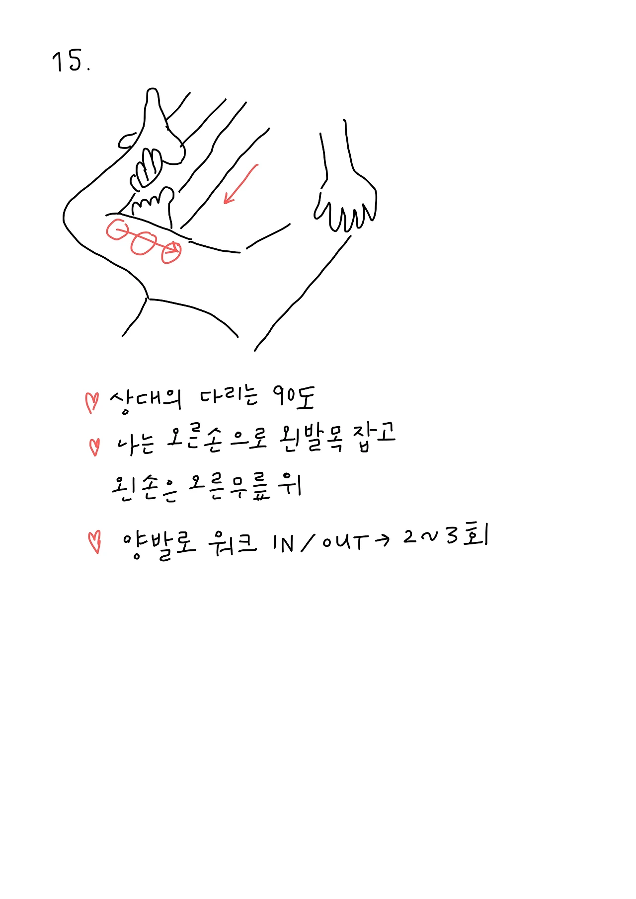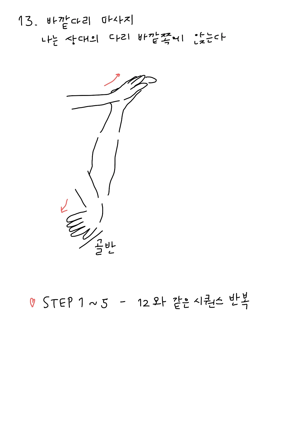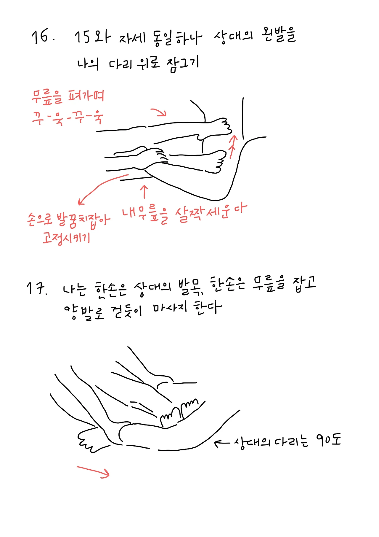 다음은 바깥다리 마사지로 나는 상대의 다리 바깥쪽에 앉는다. 방향만 바뀌었을 뿐, 앞서 실행했던 12번을 반복하여 행한다.