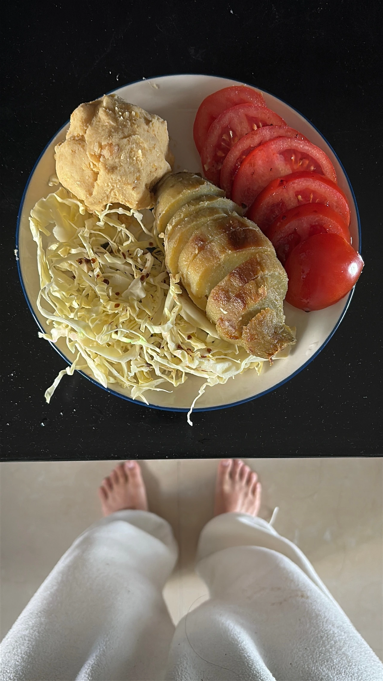 냉장고를 여니 고이 넣어둔 후무스가 보인다. 식탁 위에 있는 토마토를 썰고, 후무스를 올리고, 양배추도 한 움큼 올렸다.