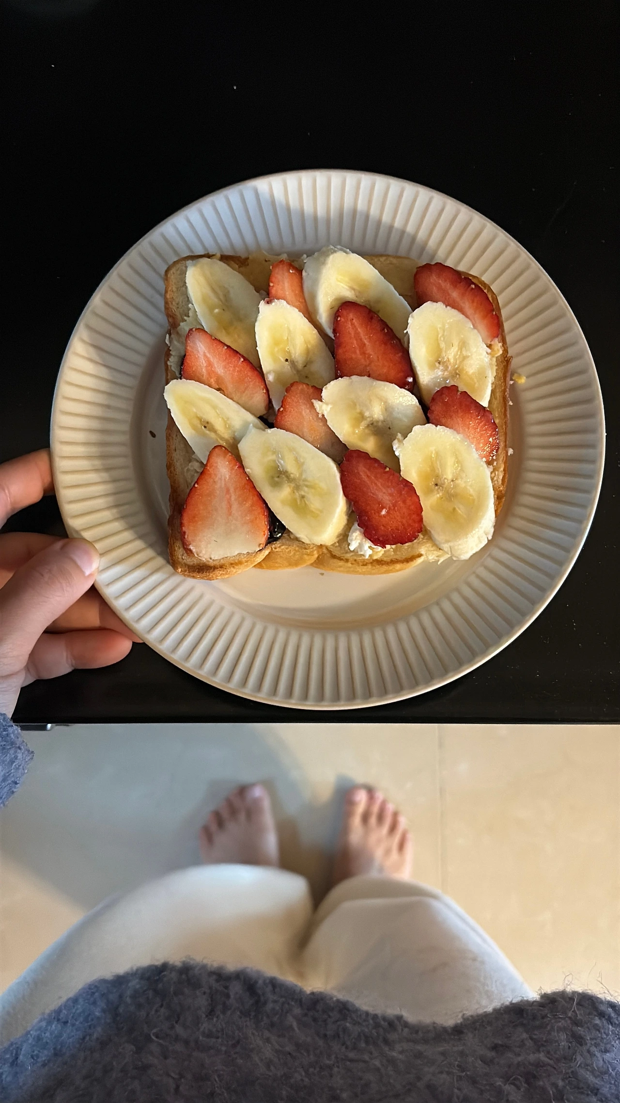대신 과일을 얇게 썰어 빵 위에 올렸다. 이렇게 아침 뚝딱 완성.
