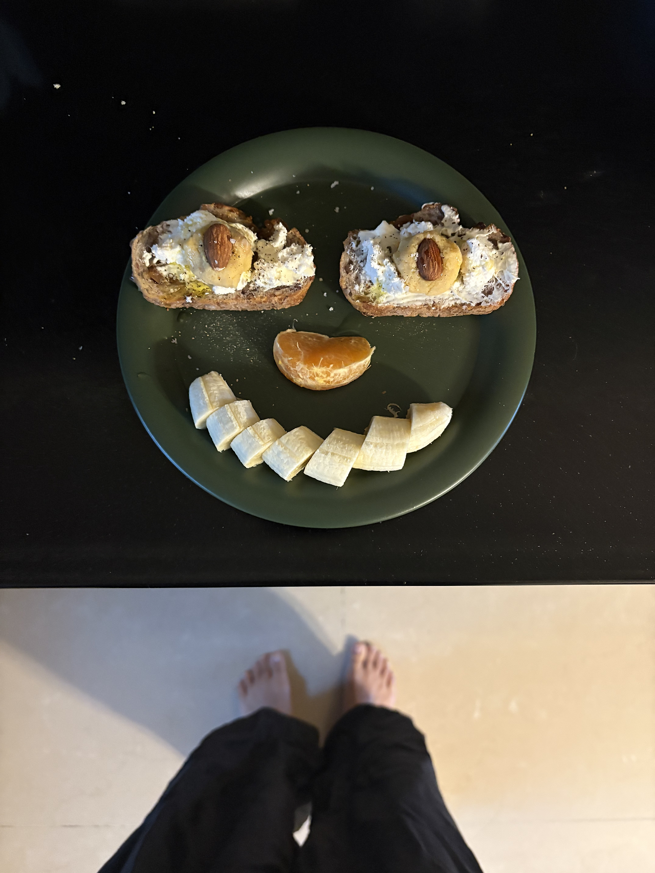 그렇게 차곡차곡 빵 위에 올리다 보니 눈이 완성되었고, 바나나를 썰어 올리니 나도 모르게 웃고 있는 접시를 발견했다.