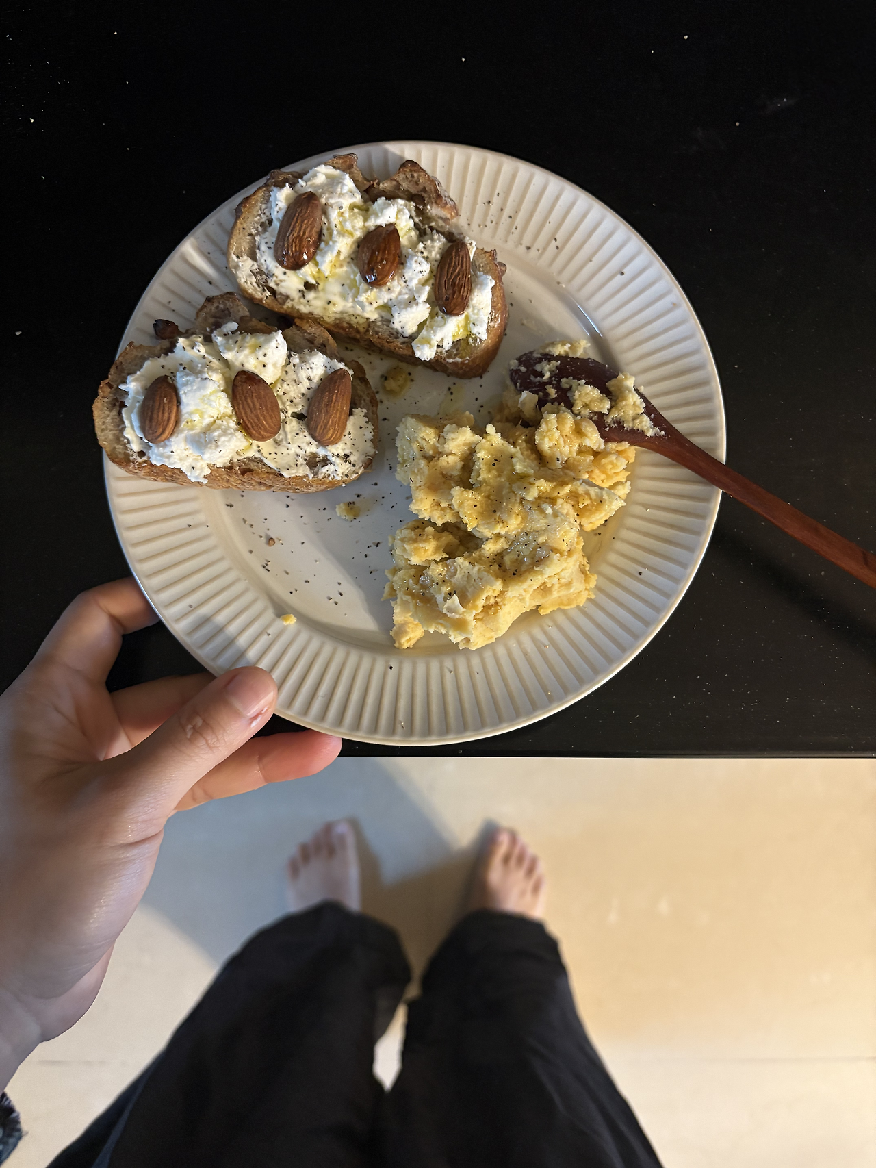 머리도 말리지 않은 채 수건으로 머리를 휭휭 휘감고 냉장고 앞에 섰다. 무화과 깜빠뉴 위에 이것저것 올려 먹을 생각이다. 크림치즈와 리코타치즈, 후무스를 꺼낸다. 요즘 나의 아침 트리오.