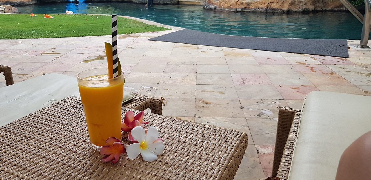 풀 바(pool bar)에서 알코올이 살짝 들어간 망고 주스(?)도 하나 시켜, 썬베드에 누워 엄마 한 입 나 한 입 나눠 마셨다. 엄마는 주스가 20달러라는 말에 깜짝 놀랐지만, 나는 평소에도 밥보다 비싼 음료수를 자주 마셨던 게 떠올라 마음이 살짝 무거워졌다.