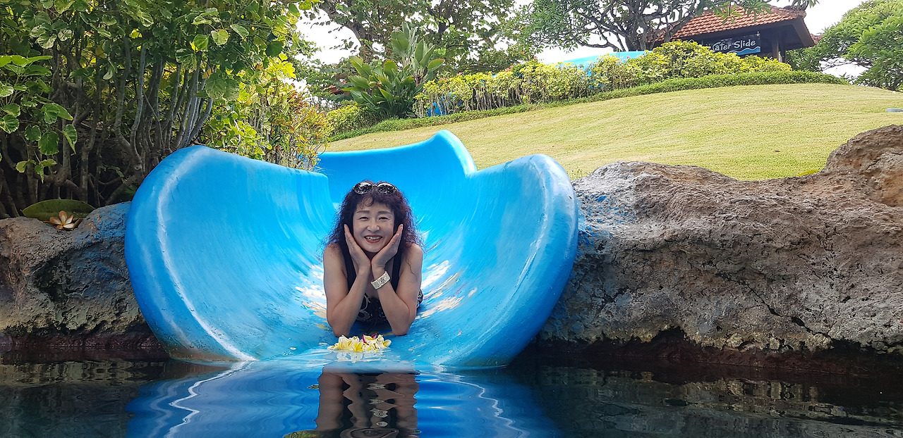 역시나 엄마는 어제의 워터 슬라이드를 또 타고 싶어 했고, 주변을 한 바퀴 다 돈 우리는 다시 호텔 수영장으로 돌아왔다. 그러나 아뿔싸, 분명히 브로셔에서 봤는데... 오늘부터 워터 슬라이드가 정비에 들어간다는 걸 분명히 읽었는데... 그걸 잊어버리고 있었다. 엄마는 그럴 줄 알았으면 어제 더 많이 탔을 거라며 아쉬워하는 기색이 역력했고, 우리는 물놀이용으로 옷도 다 갖춰 입고 나온 터였기에 그냥 물에서 좀 놀다 가기로 했다.