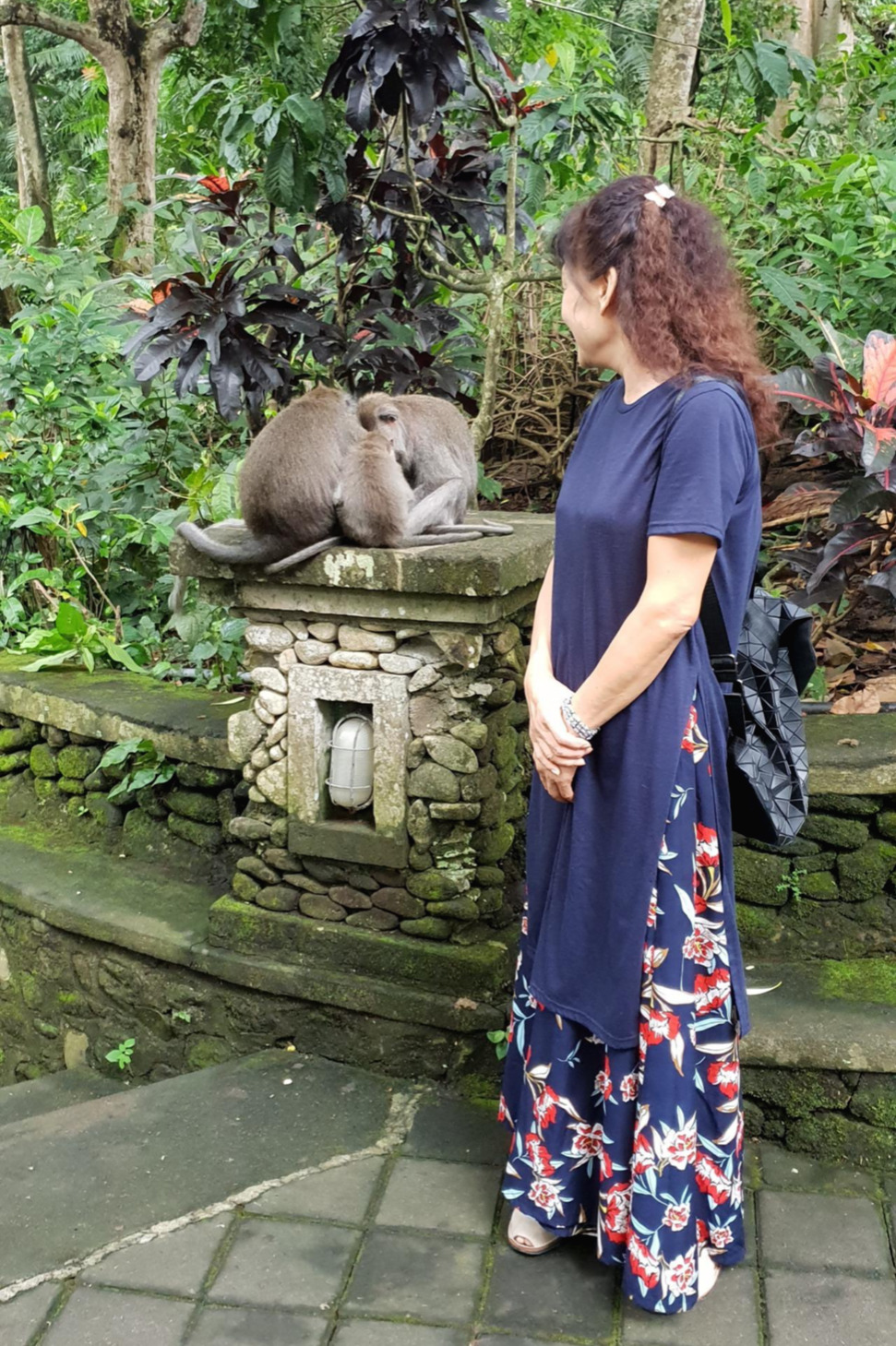 이모티콘을 닮은 익살스러운 원숭이 조형물들을 지나 좀 걸었더니 정말 원숭이들이 많이 보였다. 대부분 삼삼오오 모여있었는데, 특히나 원숭이들이 엄마에게 관심을 많이 보여서 신기했다. 어느 원숭이는 엄마 발 위에 앉아버리기도 하고, 어느 원숭이는 엄마의 가방에 매달리기도 하고, 심지어 어떤 녀석은... 엄마의 가슴을 만지기도 했다! 엄만 줄 알았나? 잠시 당황했지만 그 상황 자체가 너무 웃겨서 곧 엄마랑 신나게 웃어버렸다.