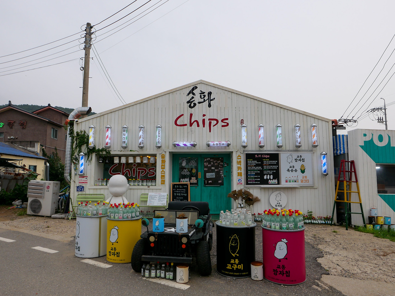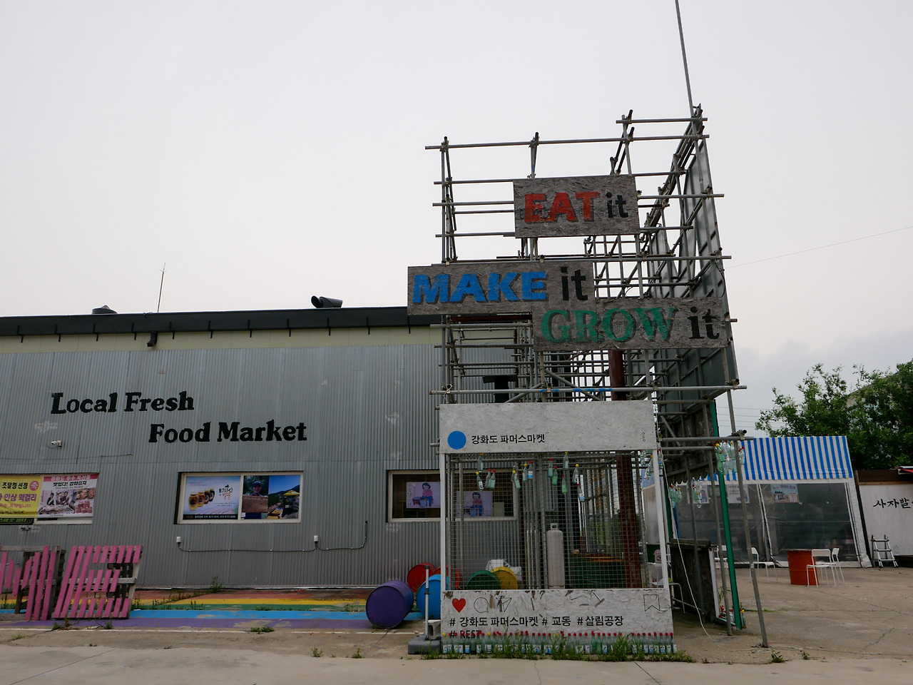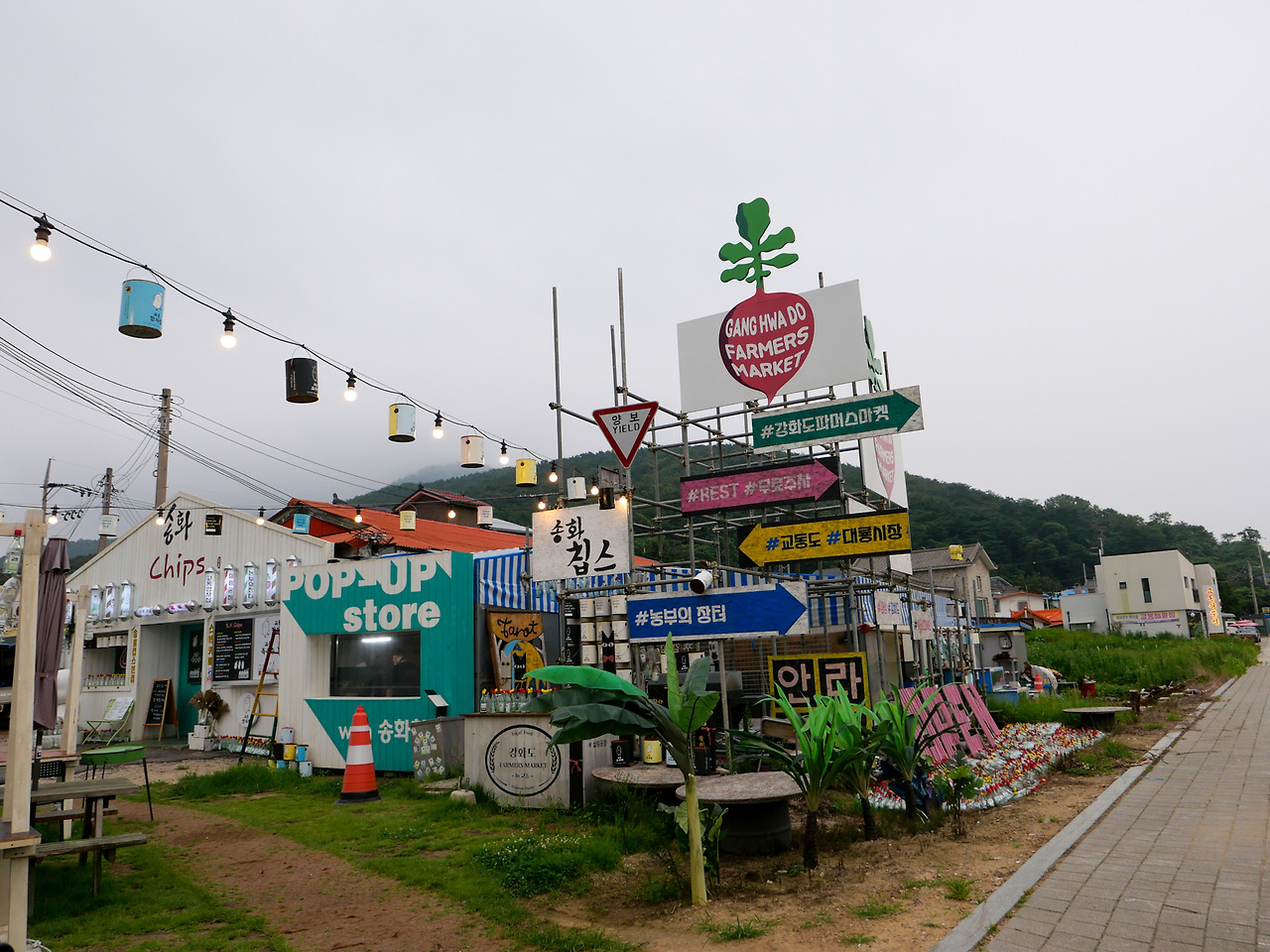 대룡시장 입구 쪽에 보면 송화칩으로 소금이나 후추를 사용하지 않은 감자칩을 판다. 한 입 먹었을 때 진짜 소금 뺀 과자 맛이라 심심하다고 생각했는데, 이상하게 하나 둘 계속 들어갔다. 묘한 중독. 페인트 통에 들어 있는 감자칩은 나중에 저금통으로 사용할 수도 있다. 그 바로 건너편에 파머스마켓이 있다. 강화도 농산물이나 특산물 등을 구매할 수 있는 곳 같았는데, 우리가 갔을 땐 이미 문이 닫힌 상태였다. 까비.