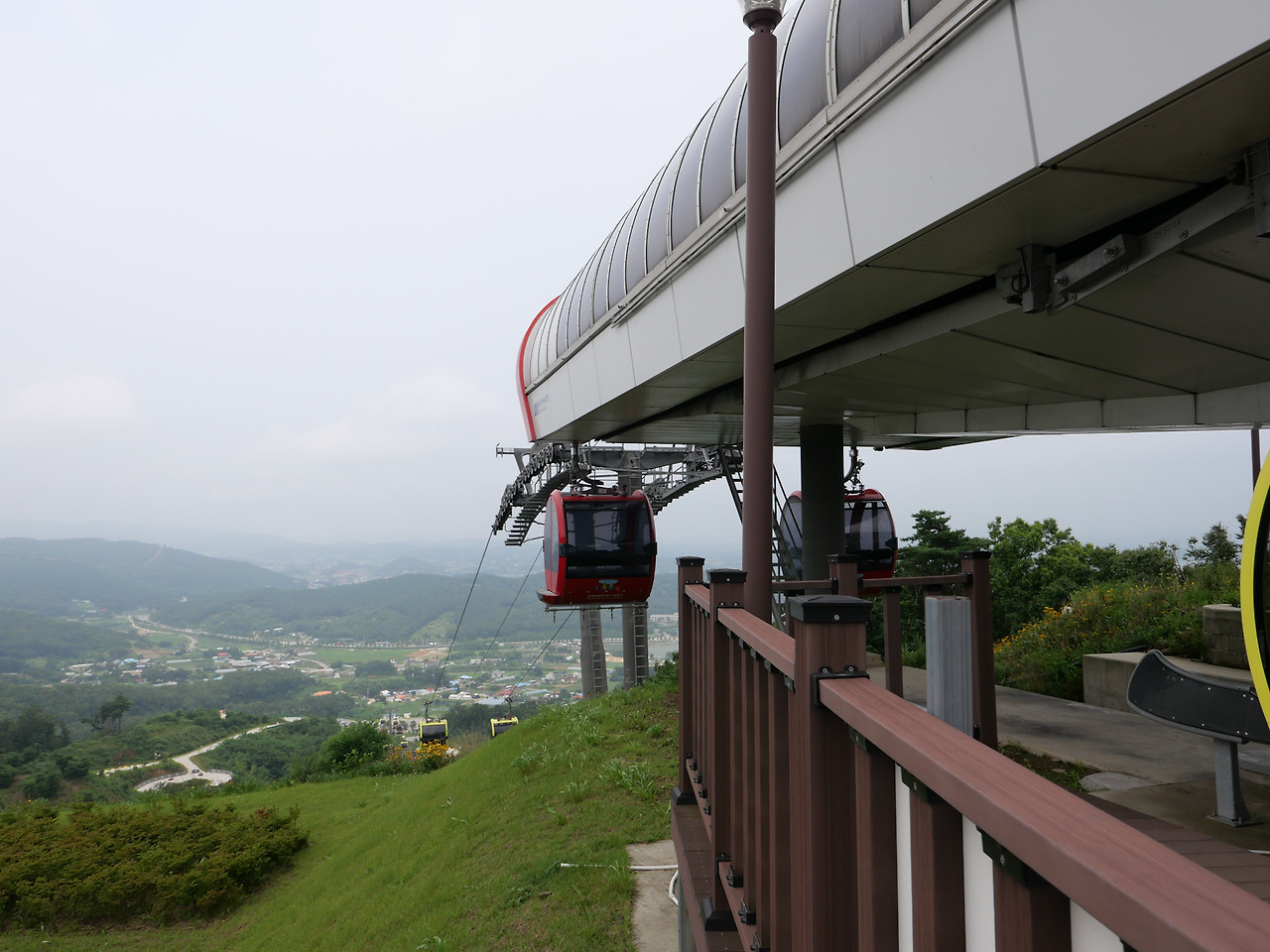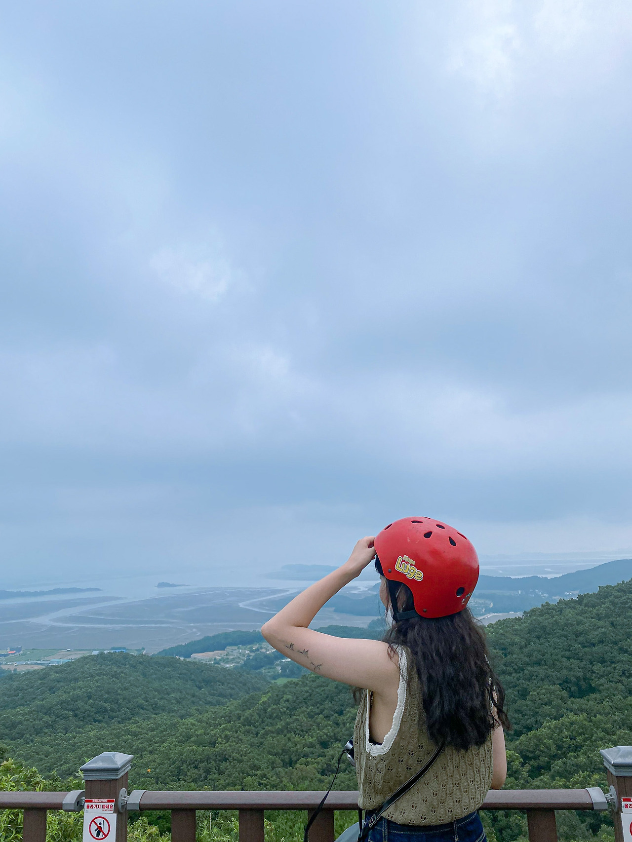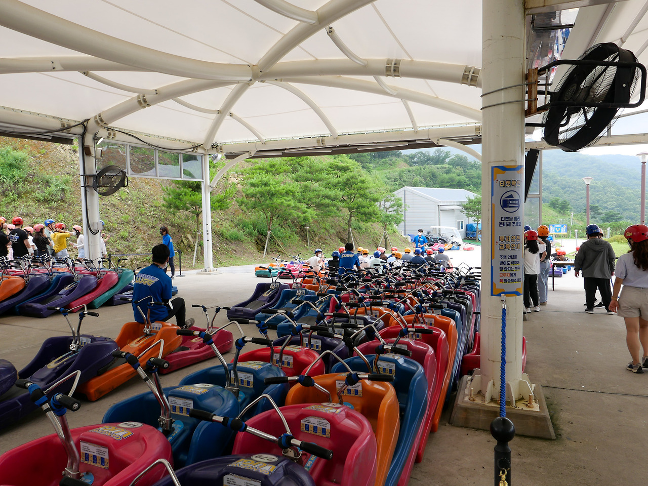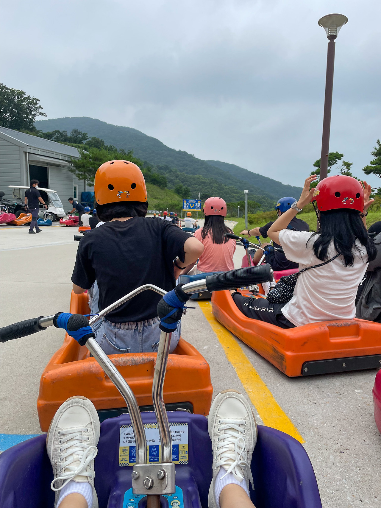 간단하게 루지 교육을 받았다. 앞으로 가는 법, 멈추는 법. 운전할 땐 사진 촬영이 불가능하며 핸들을 잡지 않으면 사고로 발생할 수 있다는 주의사항까지. 무언가의 떨림과 함께 달리기 시작했다. 다른 사람과 부딪힐까 봐 걱정했는데, 다들 나를 비켜갔다. 친구와 내려가면서 서로 무섭다고 거북이걸음처럼 천천히 갔다. 다음 탑승자가 교육받고 내려올 때까지. 천천히 내려오니까 저 멀리 보이는 풍경이 스위스 같았다. 초록을 거머쥔 작은 마을처럼 보였달까. 갑자기 과감해지고 싶어서 손에 힘을 풀고 달렸다. 곡선이 보일 때마다 다시 손에 힘을 주고 브레이크를 밟았지만, 평지에서 달리다 보니 나도 모르게 웃음이 나왔다. 그 모습이 찍혔고 해맑기도 했고 엽사 같기도 했다.