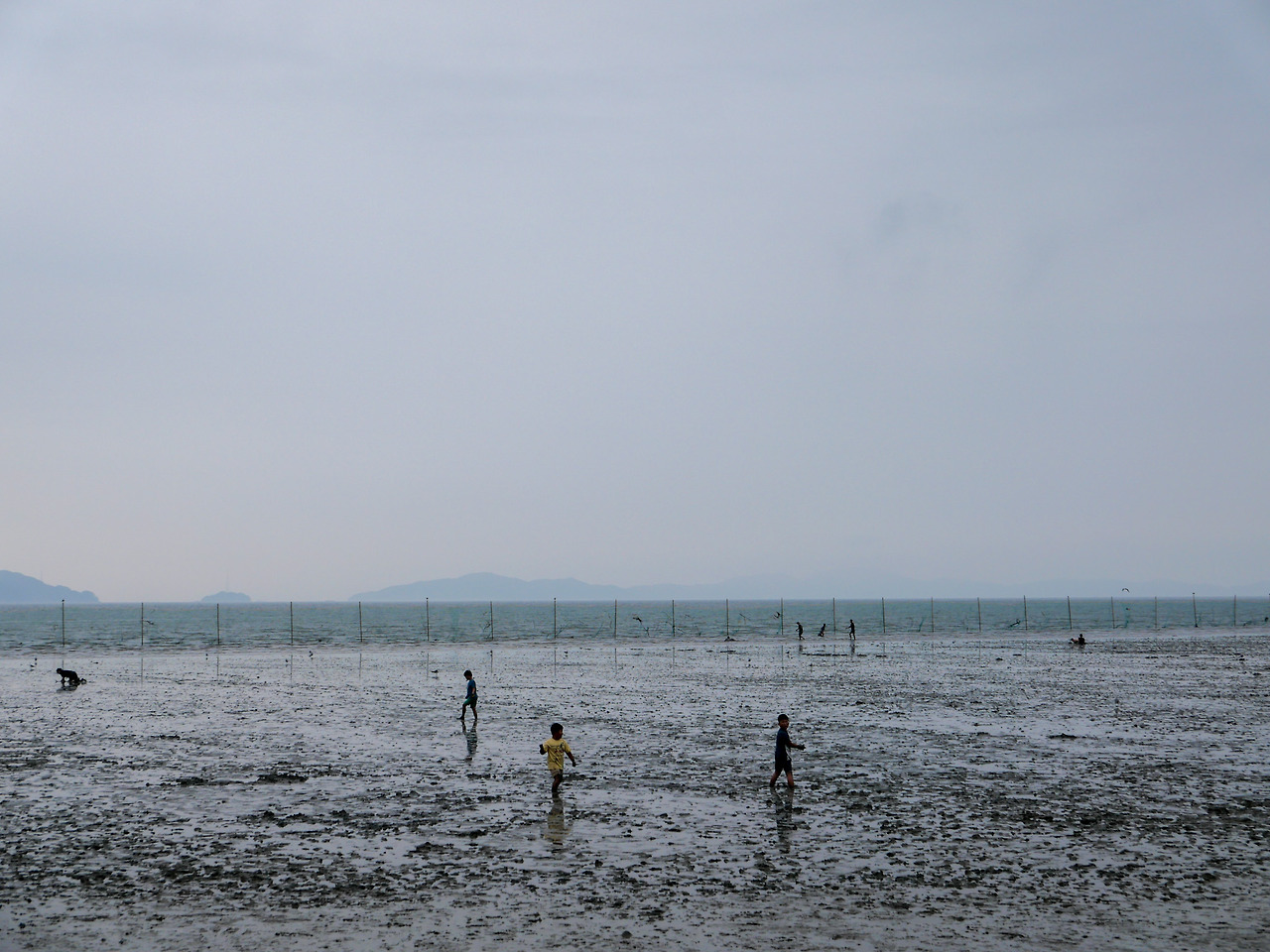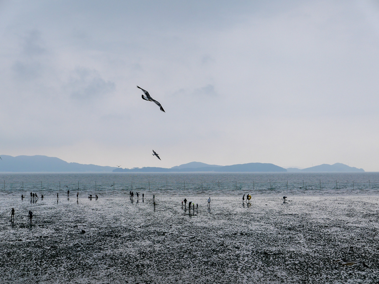 비 오는 날씨인데도 사람이 많았다. 텐트 치고 고기를 굽거나 누워서 강아지랑 힐링하거나 새우깡 던지며 갈매기와 노는 사람이 곳곳에 보였다. 비가 와서 몸은 끈적거렸지만, 바람은 시원했다. 갯벌에 들어갈 생각은 없었지만, 질척거리지 않은 곳까지 걸어갔다. 갯벌엔 구멍이 송송 뚫려있었다. 왠지 소금 뿌리면 맛조개가 빼꼼하고 나올 것 같은 느낌. 작은 꽂게가 옆으로 걸어가고 갯벌을 밟으며 뛰어가는 어린아이들의 무해한 웃음소리에 나도 모르게 기분이 좋아졌다. 나도 어렸을 땐 저렇게 얼굴에 진흙 묻히고 물고기를 발견할 땐 반갑다고 소리치며 웃었는데. 그게 뭐라고 그렇게 까르르 웃었을까.