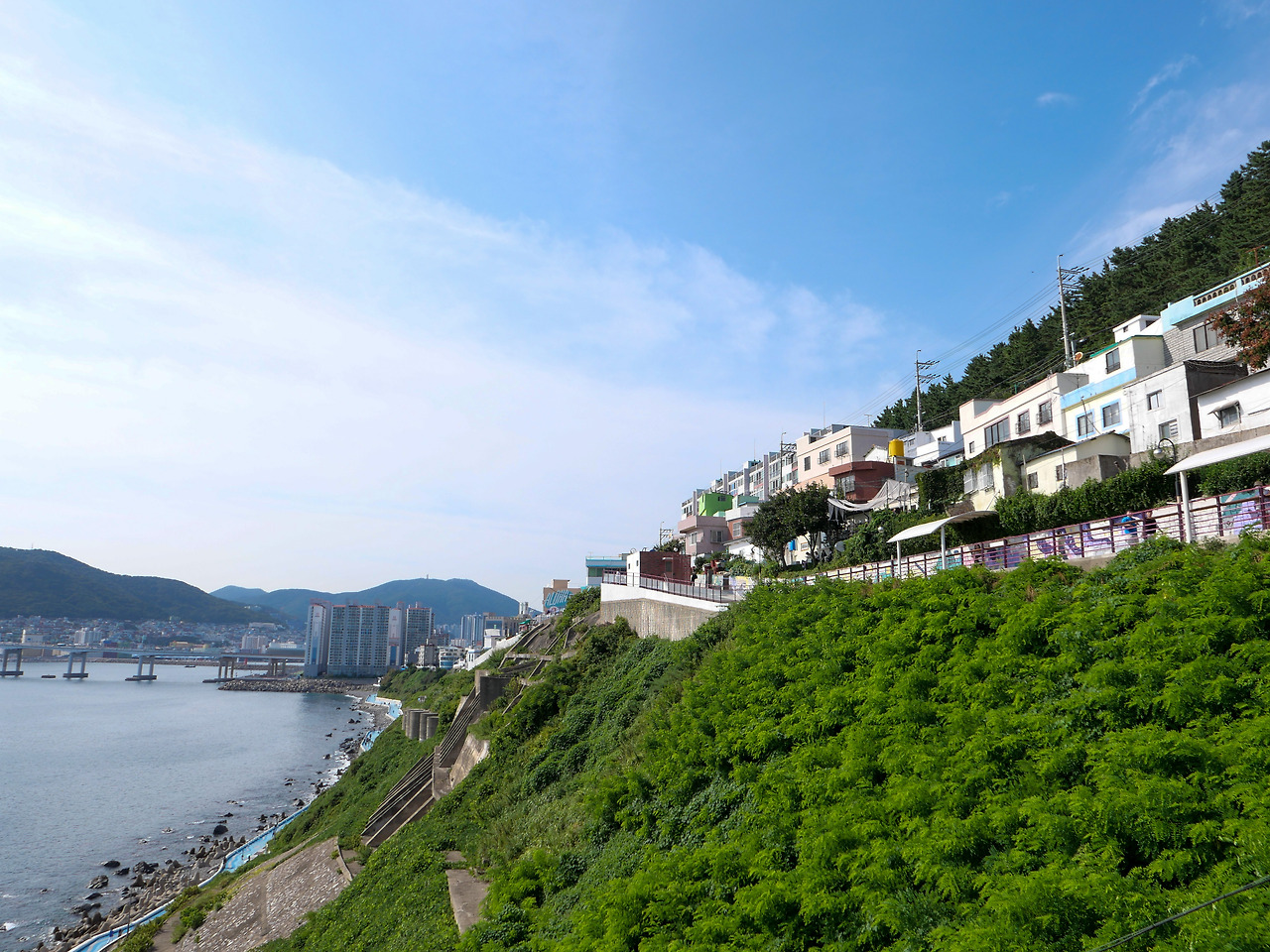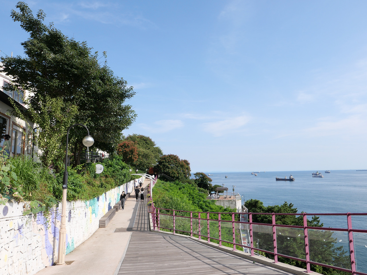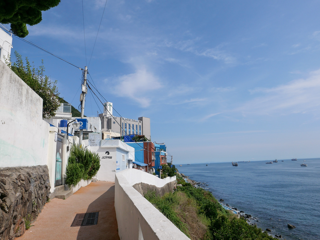 흰여울문화마을. 부산 여행 중 가장 좋았던 곳이에요. 바다가 이렇게 푸릇할 수 있을까요. 부산이 아니라 진짜 해외여행 온 듯 이국적인 느낌을 많이 받았어요. 바다 위엔 많은 배들이 떠있고 지나다니는 사람의 소리만 들리던 한적한 여행지예요. 흰색과 푸른색의 조화가 시야가 더 시원하게 만드는 기분이었어요.
