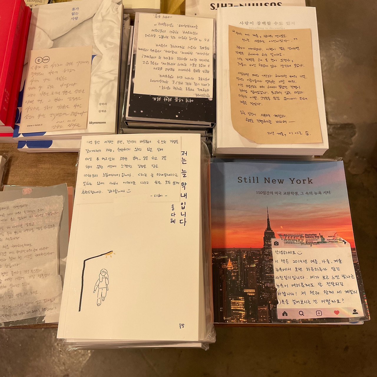 둘째 날 행사도 전날과 비슷했어요. 조금 팔렸고. 글이 좋다는 칭찬도 있었고요. <이해하는지도> <저는 늘 막내입니다> 동시에 구매하신 분도 계셨어요. 구매할지 말지 망설이셔서 당연히 안 사실 줄 알았는데 두 권 모두 사는 걸 보고 역시 감각이 있으신 분이라 생각했죠.(웃음) 취업을 준비 중인 분도 만났어요. 그분은 인스타그램에 댓글까지 남겨줬어요. 좋은 책을 알게 되어 좋았다고요. 이런 순간순간을 보고 역시 비용 대비 좋은 에너지를 얻었다고 확신했어요.