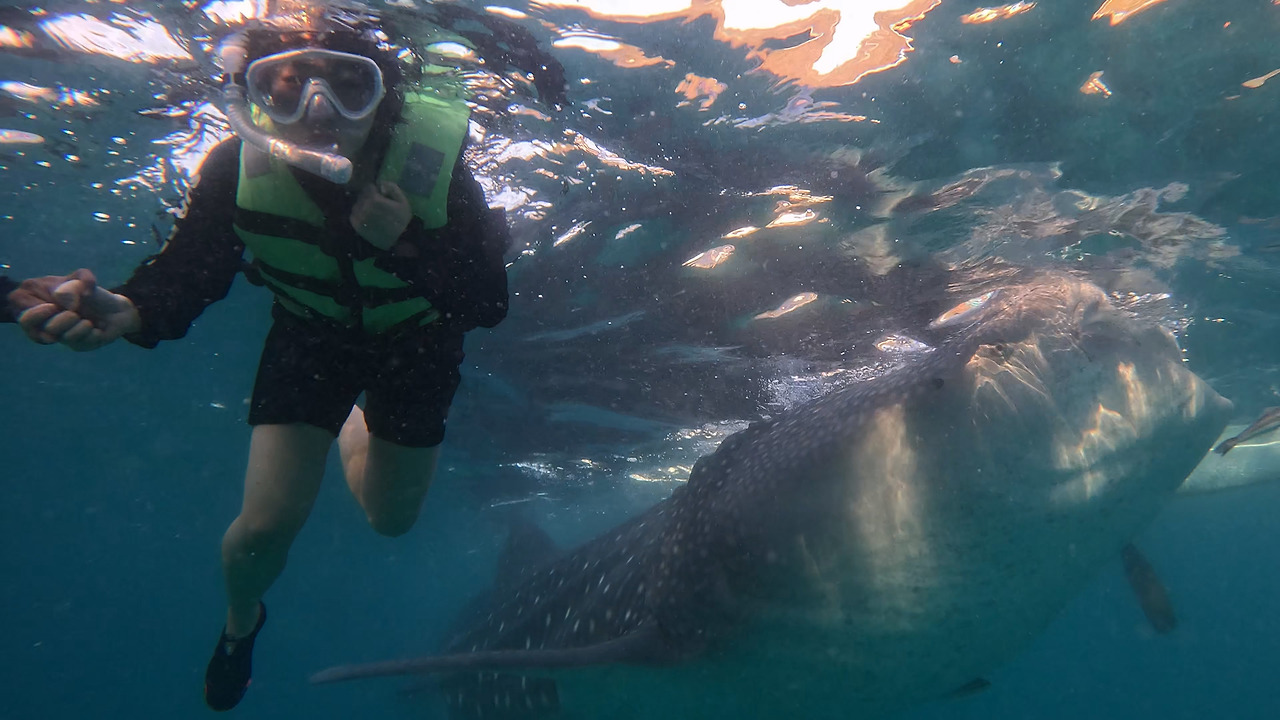 수심이 엄청 깊었다. 물이 허리까지 오는 것도 무서워서 튜브를 찾는 나인데, 바닷속은 너무 깊어 끝이 보이지 않았다. 구명조끼를 입고 있었고 바닷물이 엄청 짜서 가만히 있어도 저절로 수면 위로 떴지만 무서웠다. 가이드는 "괜찮아요?"라고 말하며 나를 잡아줬지만 혹시나 나를 놓치지 않을까 하는 마음으로 피가 통하지 않을 정도로 가이드 손을 꽉 잡았다. 스노클링 호흡법을 숙지했지만 바다에 들어간 순간 호흡법을 잊었다. 가이드는 나를 보고 "릴렉스 릴렉스, 괜찮아요"라고 했고 나는 숨을 참고 바닷속을 들여다봤다. 내 바로 앞에 엄청 큰 고래상어가 있었다. 그것도 입을 크게 벌리며 밥을 먹고 있었다. 아무런 걱정 없이 밥을 먹는 게 그저 귀여웠다.