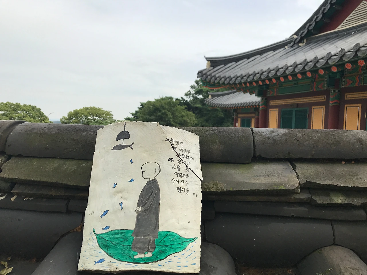 난 여행할 때마다 책을 갖고 다닌다. 그 장소에 맞을 것 같은 책. 난 종교는 없지만 불교의 색감을 좋아한다. 스토리가 담긴 벽을, 그 위에 덮인 색감을, 오래되어 나무가 바래진 것을 본다. 하나 둘 천천히 보다 보니 색에 반하고 향에 반했다. 곳곳에는 개개인의 소원이 담긴 돌이 쌓아져 있다. 이렇게 간절함이 있는 반면 어린아이들은 그냥 돌을 쌓기 바쁘다. 누가 높이 쌓는지, 서로 내기하면서. 나무 그늘 아래에 앉아 아이들이 노는 걸 보고, 소원 적는 사람들을 보고, 벤치에 앉아 소소한 대화를 나누는 사람을 보면서 ‘좋다’고 생각했다. 이들 사이에 있어서 그런가. 순수함을 어딘가 숨겨놓다가 여기에 풀어놓은 기분이다.