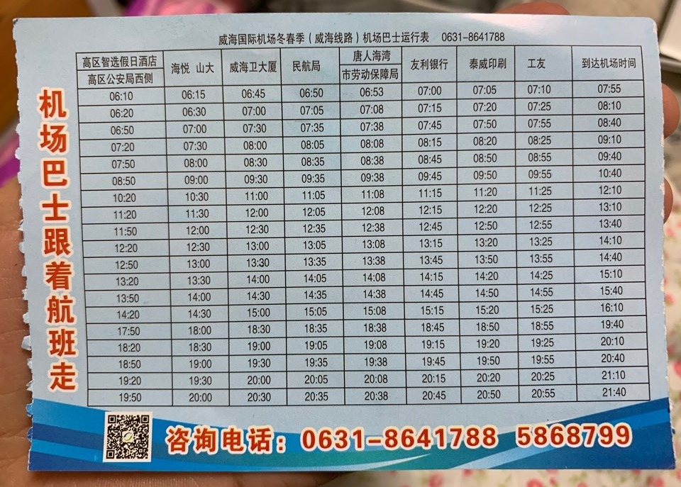 심사받을 때 입국안내원 표정이 어두워서 괜히 쫄았다. 평소 지문이 잘 인식되지 않는데 입국심사 때도 인식이 안돼서 끌려가는 상상을 해봤다. 생각만 해도 너무 아찔해. 죄가 없어도 경찰서 앞이나 입국심사 때는 괜히 쫄게 된다. 다행히 질문 없이 잘 통과했다. 짐을 찾아도 출구로 나가기 전에 짐을 한번 더 검사한다. 검사 끝나고 가방을 메니 바로 출구다. 문이 열려있었는데 사람들이 이름 적힌 팻말을 들고 있었다. 우린 자유여행객이기에 택시기사님들이 다가왔다. 하지만 우리는 버스 탈 예정! 안내원에게 물어 버스 타러 갔다. 버스 타기 전에 “웨이하이 웨이따사”라고 말하면 타라고 말한다. 가격은 20위안이며 30분 간격으로 버스가 있다. 시간표가 있으면 좋겠다고 생각하여 찍었는데 한문이네. 도움 안 될 것 같다.