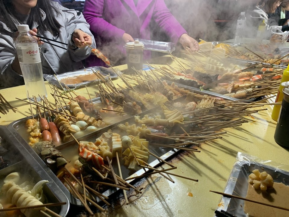 호텔 사거리 골목에 자리 잡은 야시장은 문어, 과일, 꼬치, 가리비 등을 판매하고 있었다. 뭘 먹을지 스캔하기 위해 쭉 걸었다. 다 비슷한 걸 보니 사람이 많은 곳에서 같이 먹어야겠다고 생각했다. 우선 꼬치를 먹었는데 뭘 먹어야 할지 모르겠다. 주변 중국사람 눈치를 보며 그들이 먹는걸 하나씩 먹었는데. 이게 무슨 맛이지? 한국 어묵 먹고 싶다. 8위안이라 쓰여있어서 총 4개 꼬치 32위안을 줬는데 16위안을 돌려주셨다. 뭔지는 모르겠지만 그래도 제대로 돈을 돌려주신 거에 대해 감사하다. 망고도 8위안이라고 쓰여있는데 그람을 재고 나니 17위안이라 했다. 생각보다 높은 가격을 부르지 않아서 다행이었다.