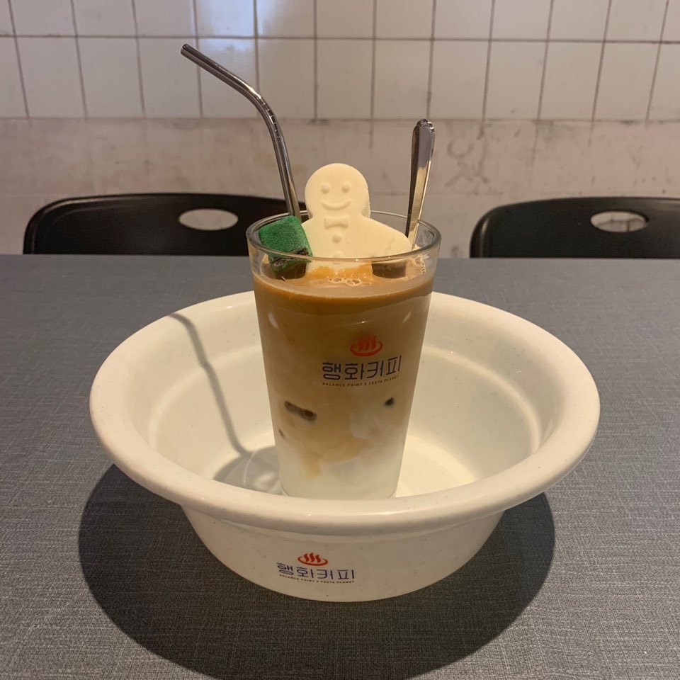 커피를 주문하고 공간을 둘러봤다. 작은 공간이었지만 때 밀었던 침대(?)와 보일러실 등을 통해 행화탕 예전 모습을 상상할 수 있었다. 그전 행화탕 사진이 있었으면 더 재미있지 않았을까? 탕이 있던 자리는 남아있지 않은 것 같았다. 그래도 타일과 간판이 남아있었다. 반신욕 라테 중에서 밍물탕을 주문했다. 과자가 녹으면서 서서히 단맛이 나는 커피다. 과자 역시 목욕탕에서 반신욕을 즐기는 것처럼 되어 있어서 귀여웠다. 커피를 쟁반 대신 바구니에 넣어서 줬다. 작은 디테일을 챙길 때 한 번 더 웃을 수밖에 없다.
