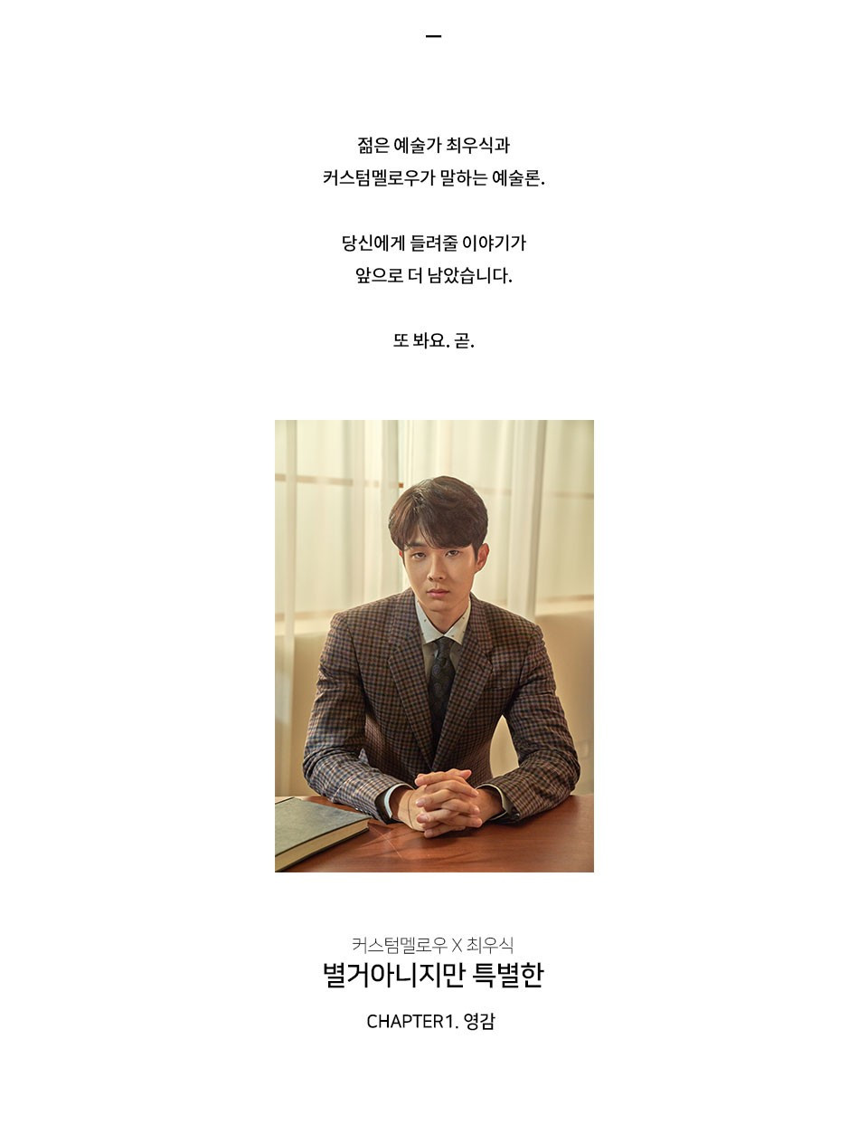 브랜드 이미지를 말할 때 마치 내게 말하는 것처럼 들릴 때가 있다. 따뜻한 말 한다미 덕분에 위로받기도 하고, 에세이 챕터를 읽은 것 같이 공감할 때도 있다. 특히 짧은 영상이라면 더더욱 감정 이입하여 공감하고 고개를 끄덕이게 된다. 이런 과정을 경험하면 브랜드에 호감도가 높아질 때도 있다. 커스텀멜로우가 그랬다. 최우식이 최근 커스텀멜로우 모델로 발탁되면서 2019F/W캠페인 영상과 화보를 공개했다. '벌거 아니지만 특별한 주제'로 예술은 누구나 할 수 있는 평범한 것이라 브랜드 이미지를 전했다.