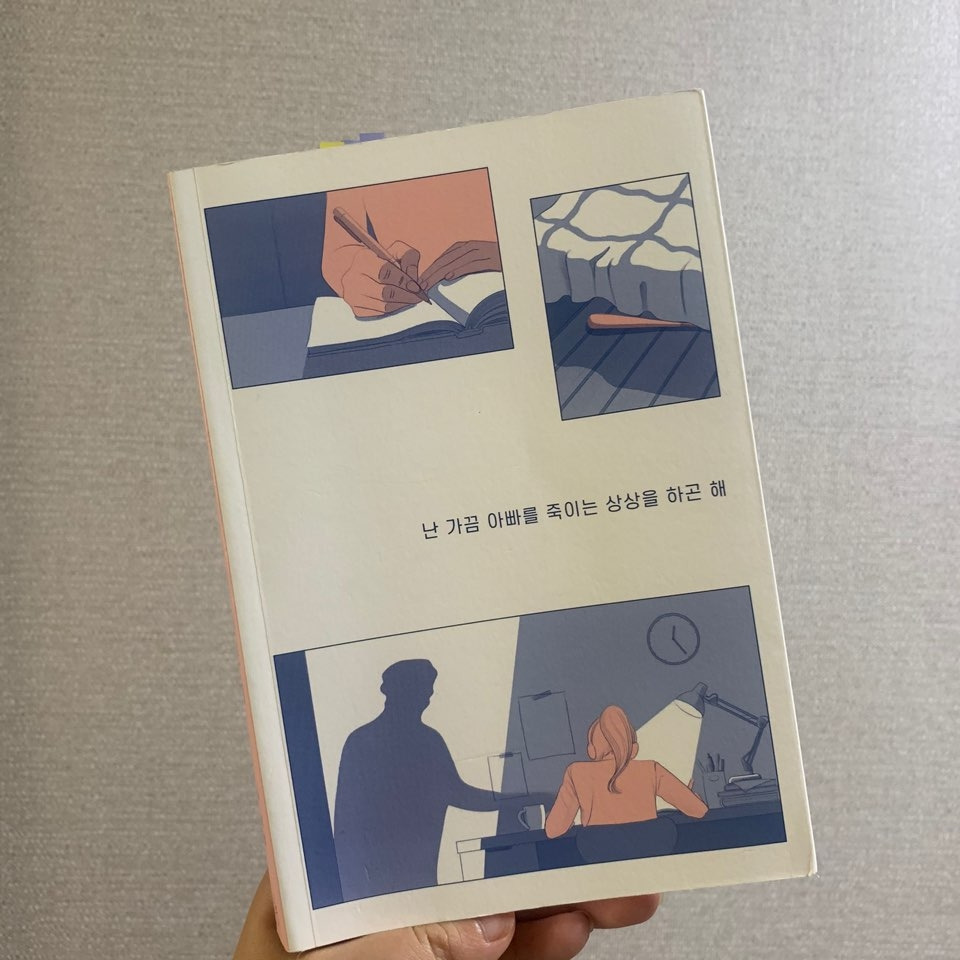 같은 상황도 개개인에 따라 다르게 받아들인다. 안타깝게도 상대가 되어볼 수 없으니 대화로 푸는 게 가장 좋다. 그럴 수 없는 상황인 경우엔 한숨만 늘어갈 뿐. 그렇기에 상담을 이용하거나 다른 해소 방법을 찾는 게 필요하다. 혼자 끙끙 앓 필요 없다. 쉽지 않겠지만. 작가는 일기를 쓰면서 조금씩 치유받았다고 한다. 물론 완벽한 건 아니지만. 가족에게 받는 상처도 풀어낼 수 있는 곳이 필요한 것 같다. 요새 가족을 현실적으로 표현한 작품이 많다. <난 가끔 아빠를 죽이는 상상을 하곤 해> 역시 가족의 한 형태이다. 이 책을 읽으며 같은 경험 혹은 비슷한 경험을 떠올리며 공감하며 작은 위로를 받을 수 있지 않을까 싶다.