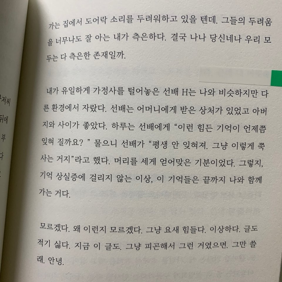 매일 일기 쓰는 것은 어렵다. 생각해 보면 난 일기를 쓰고 싶을 때만 썼다. 가끔 그 일기를 모아서 읽어보는데, 좋은 얘기보다는 주로 안타까운 이야기가 많았다. 주된 이야기는 이렇다. 다른 사람 앞에서 솔직해지지 못했던 순간, 서운했거나 상처 받았던 일. 글을 쓰면서 솔직한 나를 만날 수 있어서 일기를 썼던 것 같다. 작가 역시 10년의 기억을 책 한 권으로 털어내기 어려웠겠지만, 마음은 조금 가벼워졌다고 했다. 벗어나고 싶은 기억이더라도 꾸준히 기록하고, 생각했기 때문에 영화나 다른 형태로 표현할 수 있었고. 어떻게 받아들이느냐의 차이인 것 같다. 작가는 어둠 속에 갇혀있지 않았다. 스스로의 감정을 감추지 않고, 일기로나마 솔직했다. 그렇기에 자신뿐만 아니라 작가와 비슷한 상황에 놓인 사람들을 위로할 수 있지 않았나 싶다.