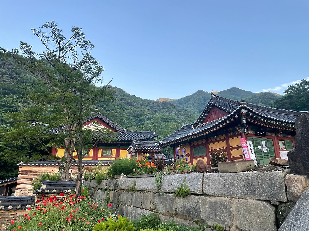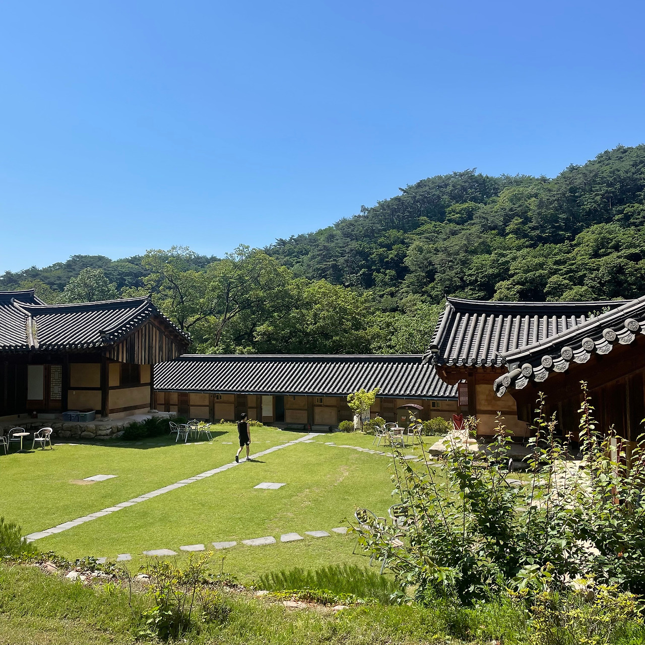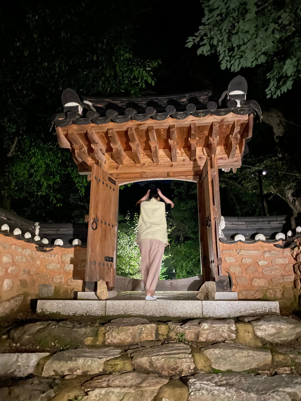 5시 30분이 되자 사람들은 잔디밭으로 모였다. 스님은 반갑게 우리를 맞이해주셨고, 사찰 하나하나를 설명해 주셨다. 불교를 잘 몰랐기에 설명은 어려웠지만 괜찮았다. 우린 배우러 온 게 아니라 머물기 위해 온 거니까. 사찰 투어가 끝나고 식당으로 갔다. 음식을 남기면 다음 생에 소로 태어난다는 말에 내가 먹을 수 있는 만큼만 담았다. 부족하면 더 먹으면 된다. 식당 안에는 묵언으로 오로지 밥 먹는 일에만 집중해야 한다. 천천히 씹으며 나물의 양념을 음미하고, 심심하고 짭조름한 반찬을 먹었다. 기대한 만큼 절밥은 맛있었다. 다 먹고 내가 먹은 그릇을 설거지하고 나오자마자 친구들끼리 "대박이다..."라고 감탄했다. 매일 고기만 먹다가 고기 없는 나물반찬을 먹었다. 맛있었다. 건강해지는 느낌도 있었고 진짜 불교를 체험하는 기분도 들었다. 먹고 잠깐 계단에 앉았다. 바닥에 쉬고 있는 나비들도 있었고, 땅을 빠르게 이동하는 개미도 있었다. 예전 같으면 놀라거나 자리를 이동했을 텐데 가만히 앉아서 그 곤충과 벌레를 봤다. 나에게 해가 되지 않다는 걸 알기도 했고 모든 생명은 소중하다는 불교의 뜻을 따르고 싶었다.