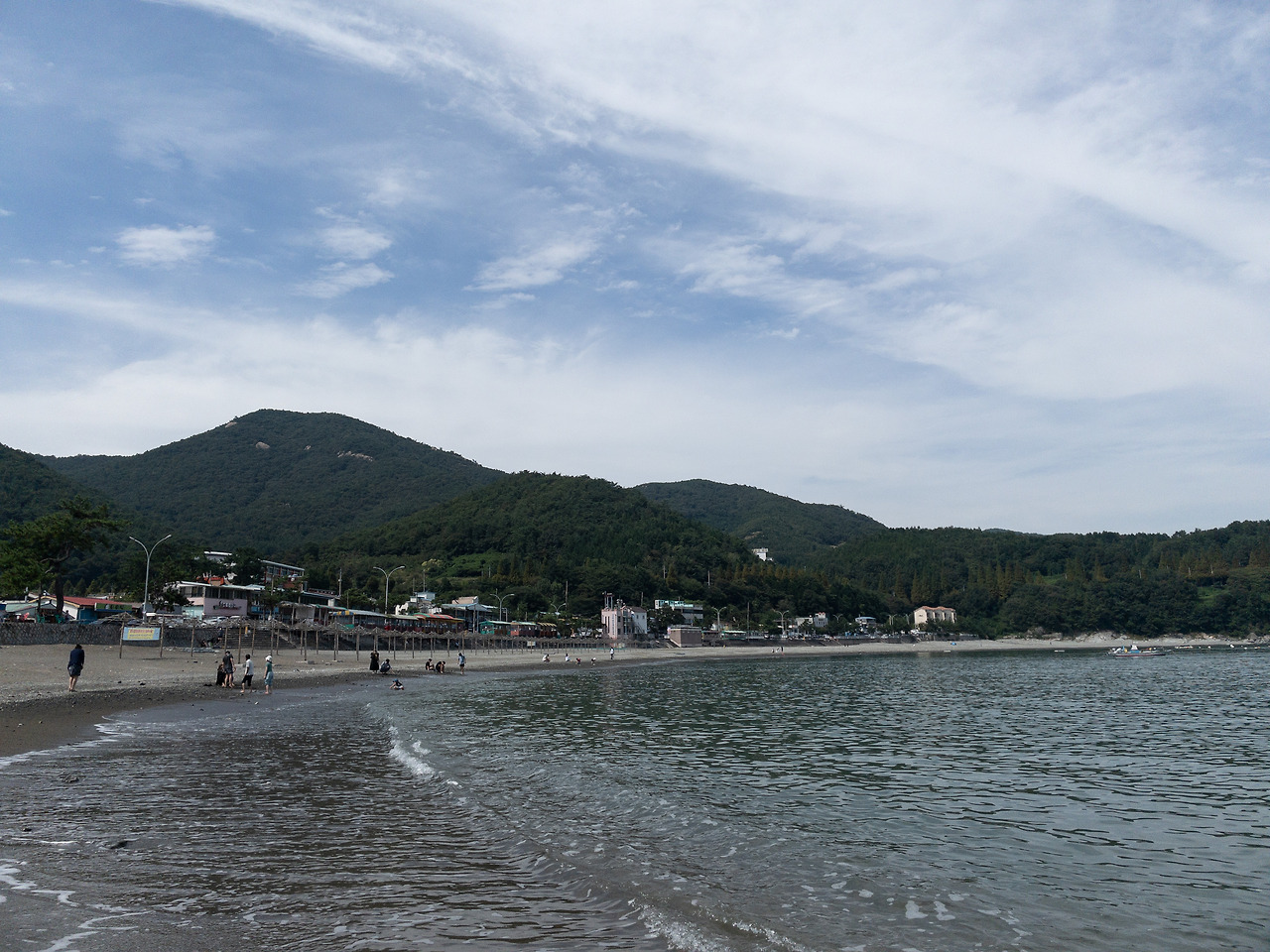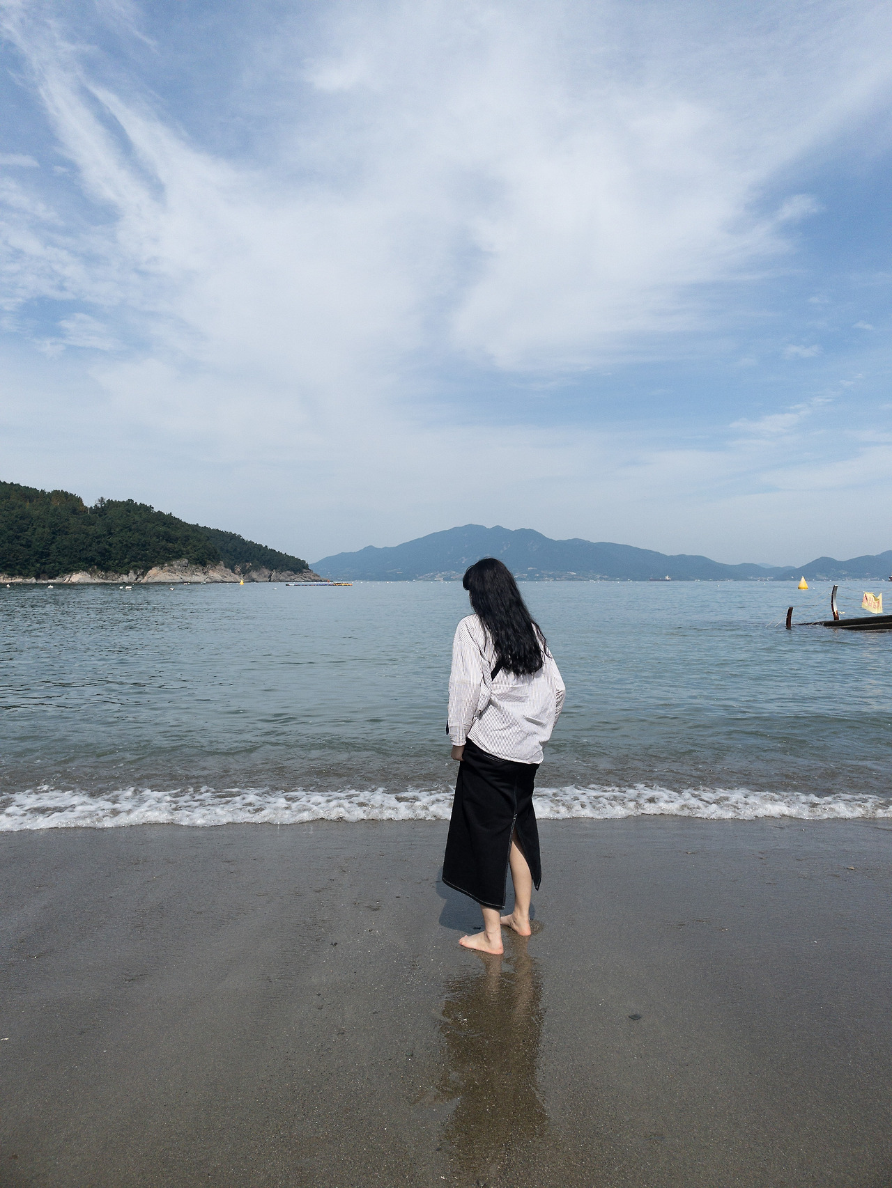 여행 가면 꼭 먹어야 하는 맛집, 음식이 있다. 다행히 나와 친구는 그런 걸 따지는 편은 아니다. 몇 시간 줄 서서 기다리며 먹기보다 배고픔을 빠르게 채울 수 있는 맛집 옆집을 선택하는 쪽이랄까. 걸어가다 보이는 햄버거 집에서 배를 채우고 본격적으로 바다로 떠났다. <알고 있지만> 여주인공 나비가 마음이 힘들어서 도망친 곳이 만성리검은모래해변이다. 택시 타고 달리다 보니 조금씩 바다가 보였다. 시야가 환해지면서 바다밖에 보이지 않은 곳에서 내렸다. 바닷물에 들어가 물놀이하는 사람도 있었고, 잠자리채로 물고기 잡는 아이도 있었다. 갈아입을 옷과 수건은 없지만, 치마를 살짝 걷어 물속으로 들어갔다.