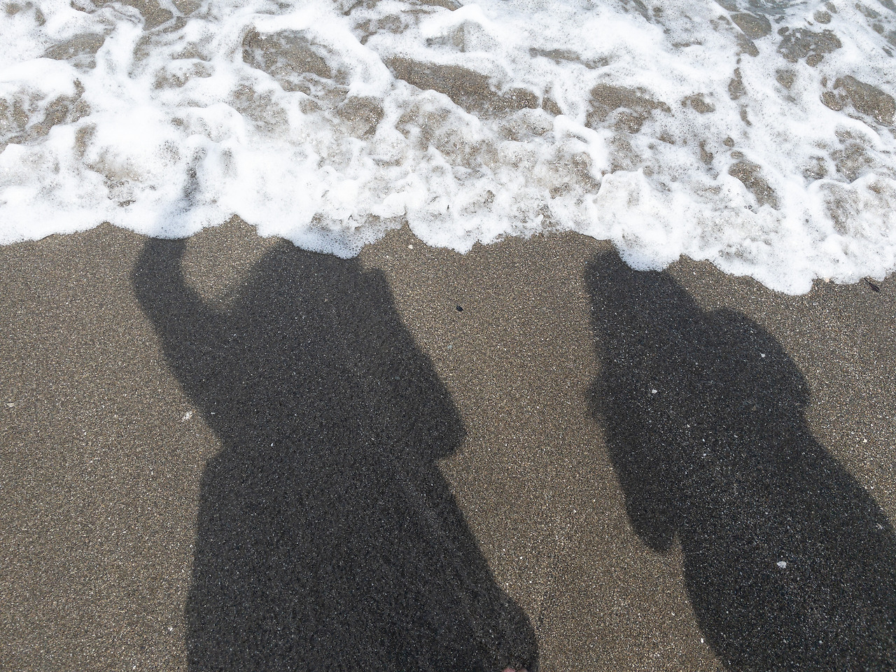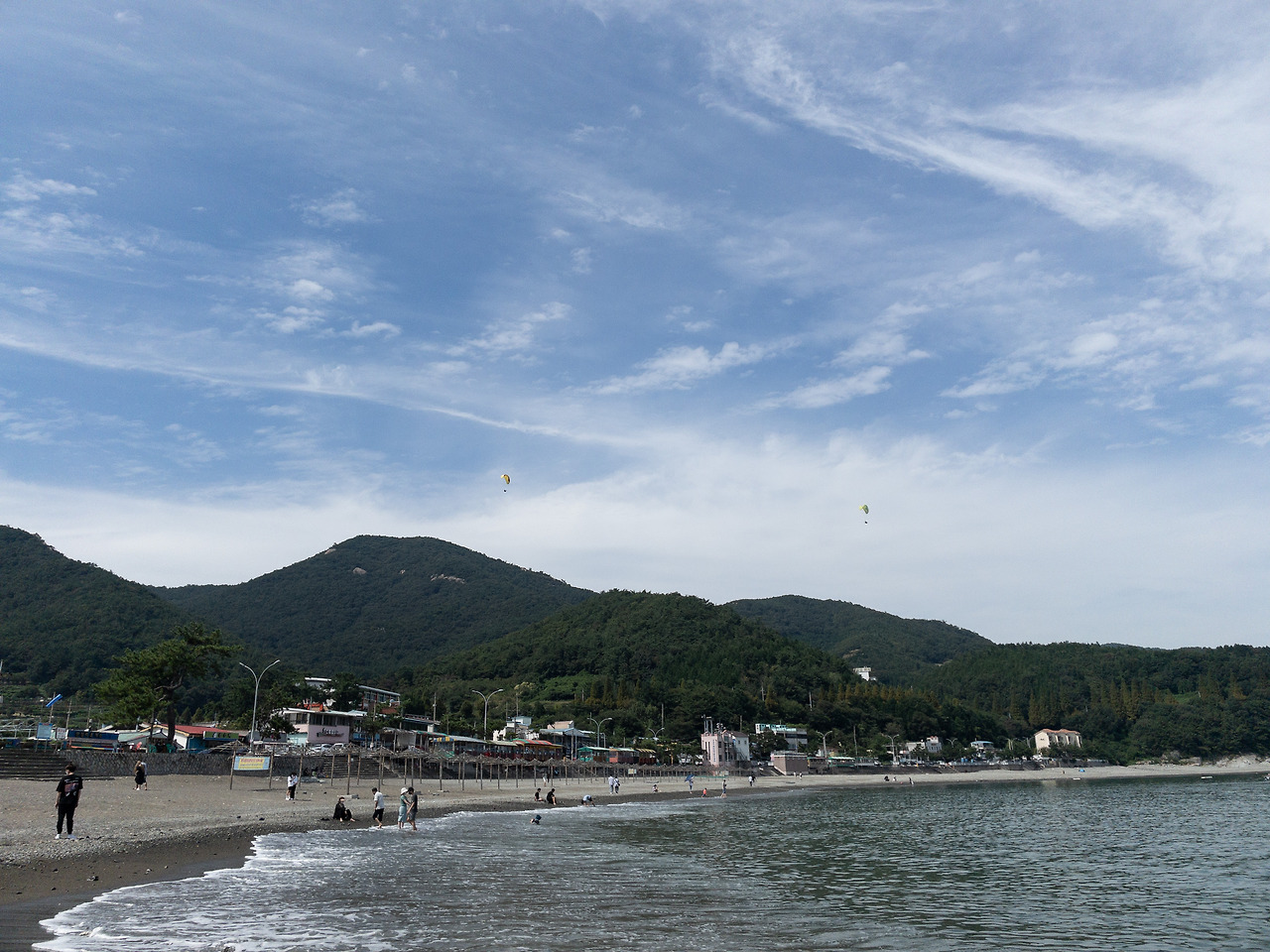 물은 차가웠고 파도는 거칠었으며 내가 밟은 모래는 미끄러워서 가만히 서있으면 모래 속으로 들어갈 것만 같았다. 어린아이처럼 파도가 올 때마다 "아악"하고 소리치며 웃었다. 발에 모래가 붙었다. 잠깐 계단 의자에 앉아 발을 말렸다. 그 시간 동안 우리보다 더 신나게 노는 방법을 아는 아이들을 봤다. 우리처럼 파도를 따라갔다가 피했다가를 반복하거나 아빠와 함께 물싸움하며 노는 아이들이 있었다. 아이를 좋아하지 않는데도 싱그러운 아이의 웃음은 기분이 좋아진다. 양말로 발에 묻은 모래를 털고 물을 닦아냈다.