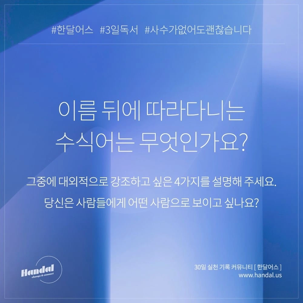 나는 ‘함께’라는 가치를 믿고 신뢰한다. 한달어스를 통해 혼자보단 함께할때 그 가치가 몇 십배로 증폭되며, 혼자선 불가능했던 일을 함께라는 이유로 극복하고 더 성장하는 모습을 보며 더욱 확신하게 되었다.