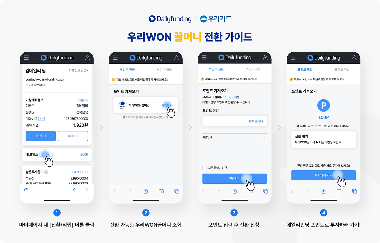 우리카드 고객은 데일리펀딩 홈페이지에서 ‘우리WON멤버스’ 꿀머니를 투자 자금으로 전환할 수 있다. 다른 포인트 사용처와 마찬가지로 1꿀은 1p의 가치를 지닌다고. 포인트 전환은 10꿀 단위부터, 하루 최대 10만꿀, 연 최대 100만꿀 가능하다.