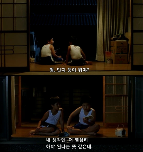 형 코이치는 해체된 가족의 재결합을 간절히 꿈꾸는, 의젓한 소년이다. 동생 류노스케는 이러한 불균형적 분리 상태가 자신에게 어떠한 영향을 끼치는지 인지하지 못한다. 영락없이 순수하고 천진한 아이의 표정으로 그저 매일 벌어지는 모든 소소한 일들이 즐거울 뿐이다. 흥미롭게도 아버지와 함께 사는 류노스케, 어머니와 함께 사는 코이치, 둘은 대조적인 일상생활의 영역에 속해 있다. 류노스케는 인디음악을 하는 아버지의 영향을 받아 매 순간 밝고 즐거운 성향을 보여주며 집안일부터 끼니를 챙기는 것까지 독립적으로 해낸다. 반대로 코이치는 어머니와 할머니, 할아버지의 따듯한 보호 아래 매일 평온한 하루를 보낸다. 식사 장면에서의 교차편집은 이러한 부분을 극대화시키는 효과를 준다. 혼자 밥을 먹는 류노스케와 도란도란 둘러앉아 함께 밥을 먹는 코이치의 모습을 번갈아 가면서 느릿하게 보여주는데, 왠지 모르게 뭉클함이 느껴진다.