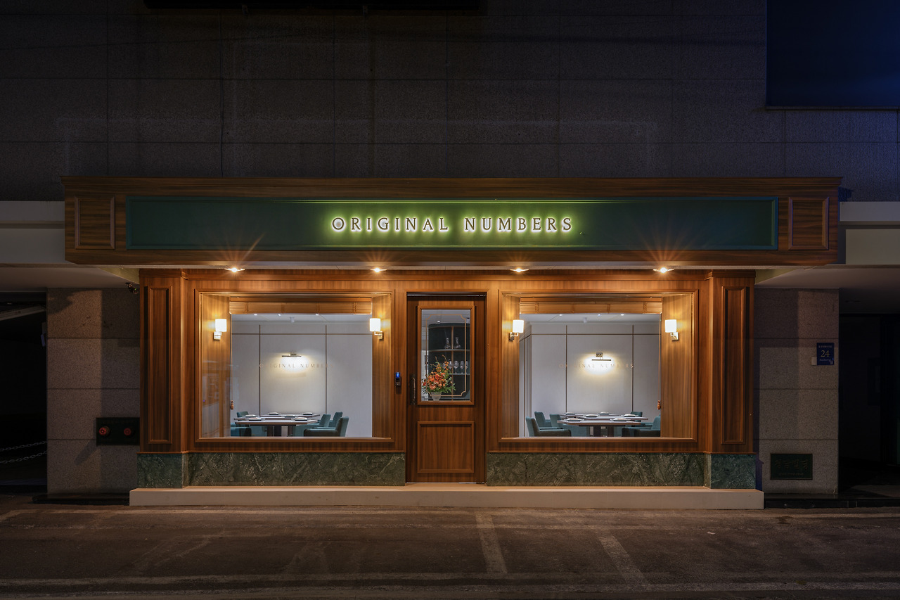 오리지널넘버스는 중앙 출입구 좌/우로 큰 유리창이 설치되어 있다. 가까이 가지 않으면 내부가 자세히 보이진 않지만, 멀리서 봤을 때는 오래된 아틀리에의 모습으로 보여지게 디자인했다. 월넛의 우드톤과 다크그린의 천연대리석의 클래식한 조합은 앤틱한 모습을 만들어내기에 충분하다. 출입을 위해 매장 가까이 다가서면, 내부의 밝은 모습에 기대감을 갖도록 무드를 만들었다. 앤틱한 손잡이를 당겨서 내부로 들어가면 외부와 다르게 단정하고, 밝은 느낌으로 표현했다. 들어서면서 느끼는 부담감을 최소한으로 줄이고 싶었고, 처음 응대하는 매니저의 모습이 조금이나마 기분 좋게 느껴지길 바랬다. 그렇게 좌석으로 안내 받으면, 또 한번 시퀀스가 바뀐다. 외부의 모습과는 비슷하지만 훨씬 더 장식적인 배경을 만들어 고객의 입장에서 배경(보여지는 것)이 되기도 하고, 바라보는 뷰가 되기도 한다. 앤틱한 배경에서 즐기는 코스 요리와 와인이 더욱 특별해지길 바랬다.