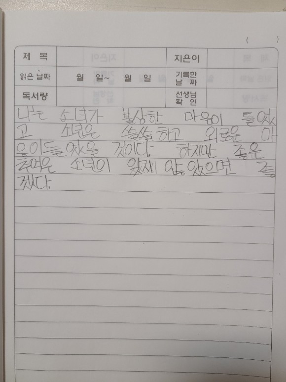 아이는 독후감 마지막에 "나는 소녀가 불쌍한 마음이 들었고 소년은 쓸쓸하고 외로운 마음이 들었을 것이다. 하지만 좋은 추억은 소년이 잊지 않았으면 좋겠다."라고 썼다. 앉은자리에서 연필 한번 안 놓고 쓰는 아이를 쳐다보며 어린아이들도 글쓰기에 있어 이렇게 작두를 타는 순간이 있구나 싶어 한참을 멍하니 쳐다보았다. 깨달음이 마음에 박혀 어떻게든 배출해내야 하는 짜릿한 순간이 느껴져서 신기하다 못해 경이롭기까지 했다. 아이를 키운다는 것은 어쩌면 가장 가까이에서 이런 것들을 볼 수 있다는 크나큰 특권이구나 싶기도 하다.