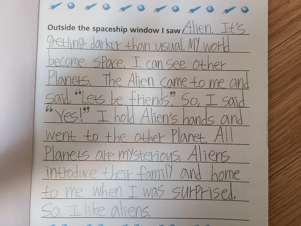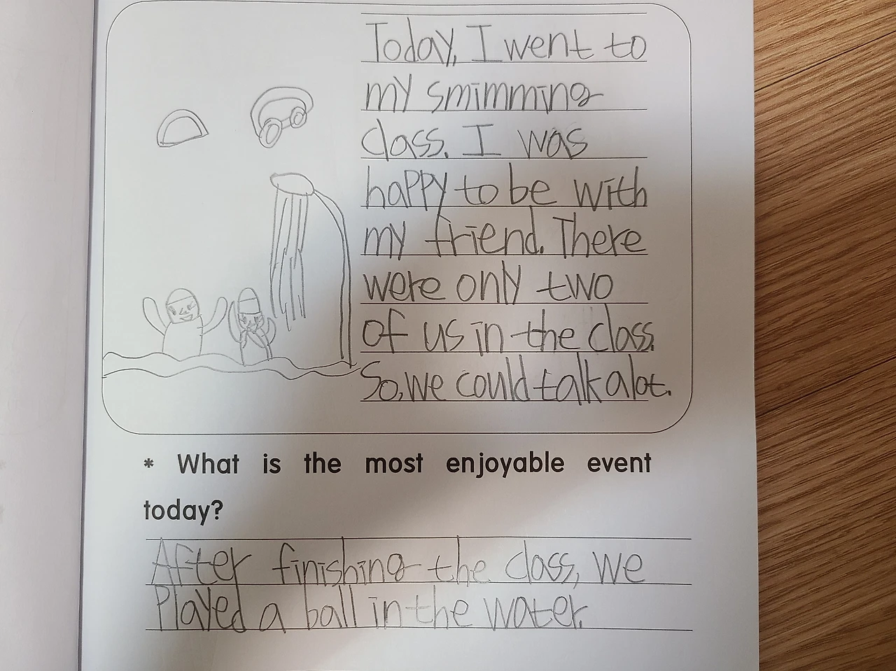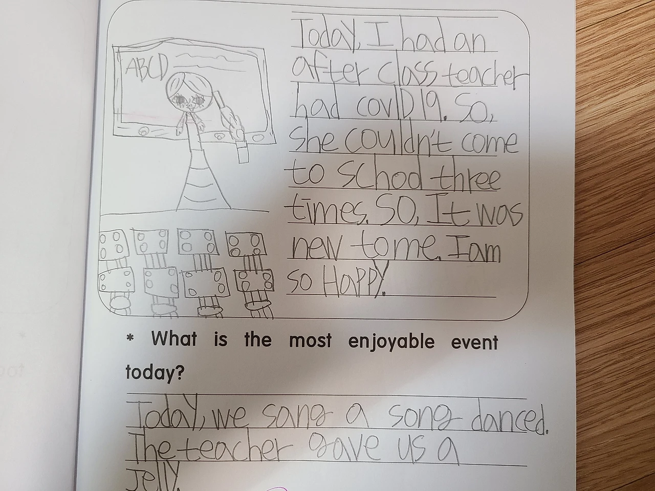 그러던 중, 아이는 어느순간 쓰고 싶어졌다. 너무 쓰고 싶은데 영어가 안나와서 답답함을 느끼고 이제는 막 되도 않는 말을 쓰는데 스펠링을 몰라서 계속 와서 묻는다. 스펠링은 엄마가 써준 것을 배껴쓰고 문장도 물어본것과 아이가 스스로 만들고 싶어 어거지노력+안간힘을 합친 것이다.