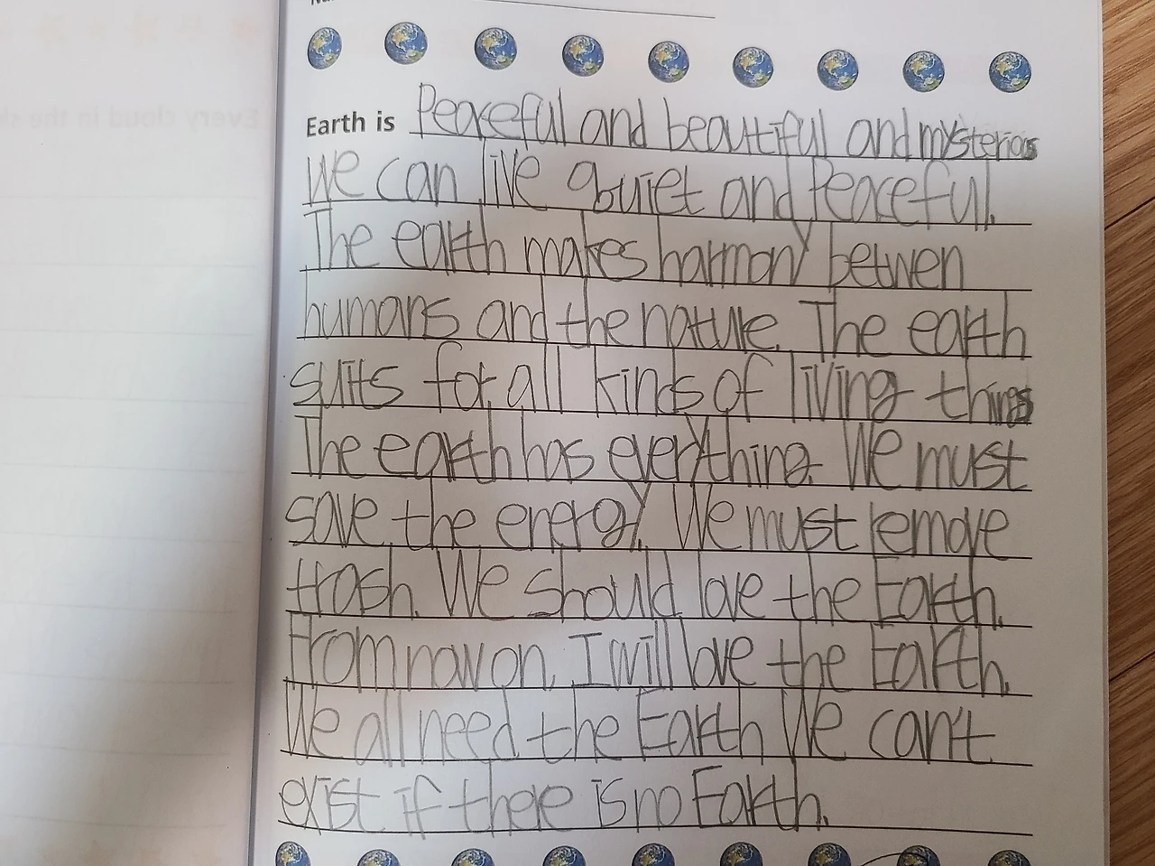 그리고, 아주 조금씩 '세계', '언어', 지구촌, 연대 등을 이야기하며 연대를 위한 수단으로서의 언어 측면에서 아이와 마음을 맞추고 열어가기 시작했다. 거기에는 학교에서 했던 굿네이버스 아동후원이 한 몫을 했고, 동네에 보이는 외국인 친구(실제 말을 하며 놀진 않지만)도 한 몫을 했고, 영화(나홀로집에부터 시작해서 크리스마스 연대기, 디즈니 만화 등등)도 한 몫을 했다.