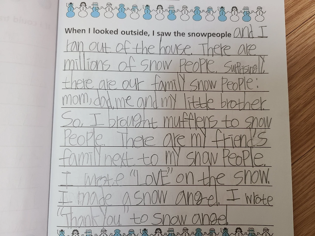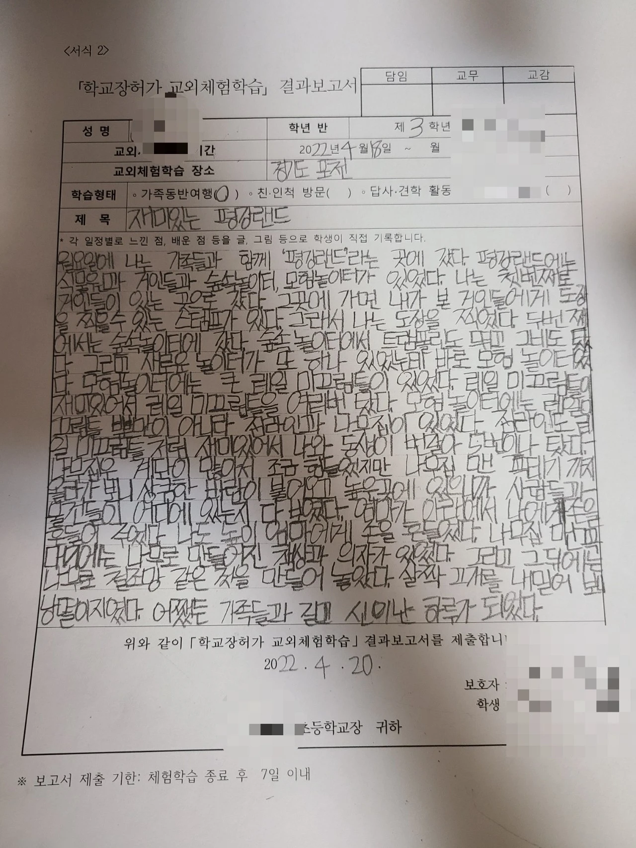 초등학교 3학년 아이의 체험학습보고서이다. 아이는 "해치웠다"는 표현이 맞을 정도로 급하게 글을 해치웠다. 내용의 유기성, 글의 구조성, 논리 프레임 등을 다 떠나 "즐거운 글쓰기"가 주는 힘을 눈 앞에서 목격하였다. 너무 쓰고 싶어서 손이 먼저 나가는 모습, 빨리 쓰고 싶어서 손이 바빠지는 모습을 본다. 마지막 마침표하나 딱 찍고 나나 아이의 표정은 아쉬운 듯 통쾌한 듯 미소가 가득했다. 그것은 분명 즐거움이 주는 동력이었다.
