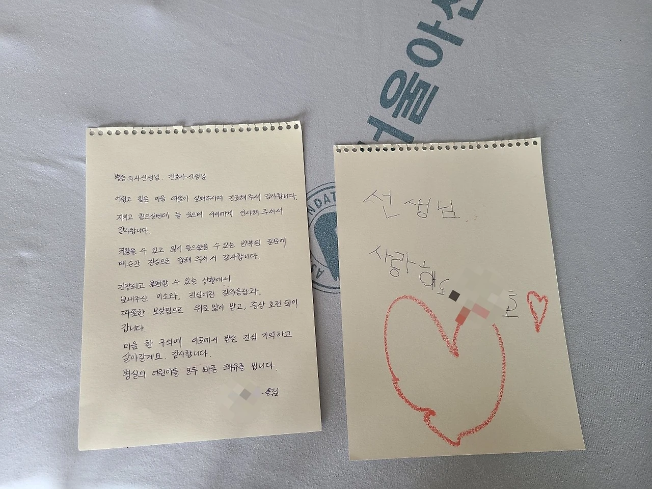 아이와 함께 편지를 쓴다. 한 글자 한 글자 마음을 담는다. 아이는 수줍게 담당 간호사 선생님께 편지를 전한다. 병원에 있는 동안, 칭찬도 많이 받고 인사도 많이 받고 따뜻함을 간직하고 떠날 수 있음에 커다란 마음의 빚을 진다.