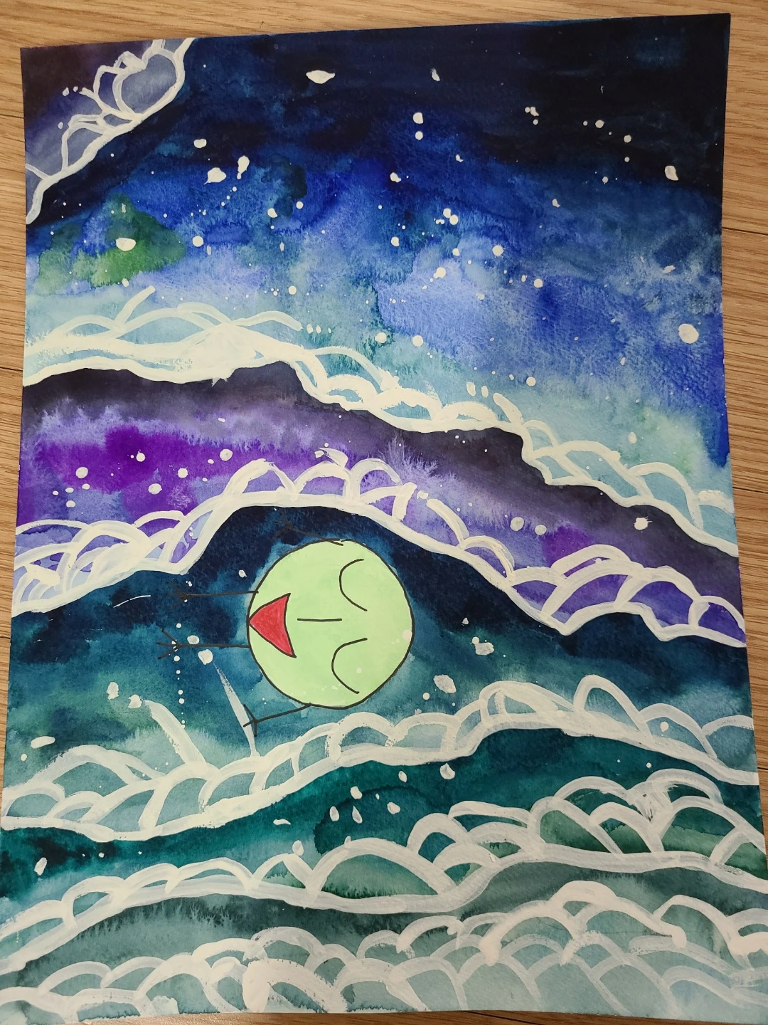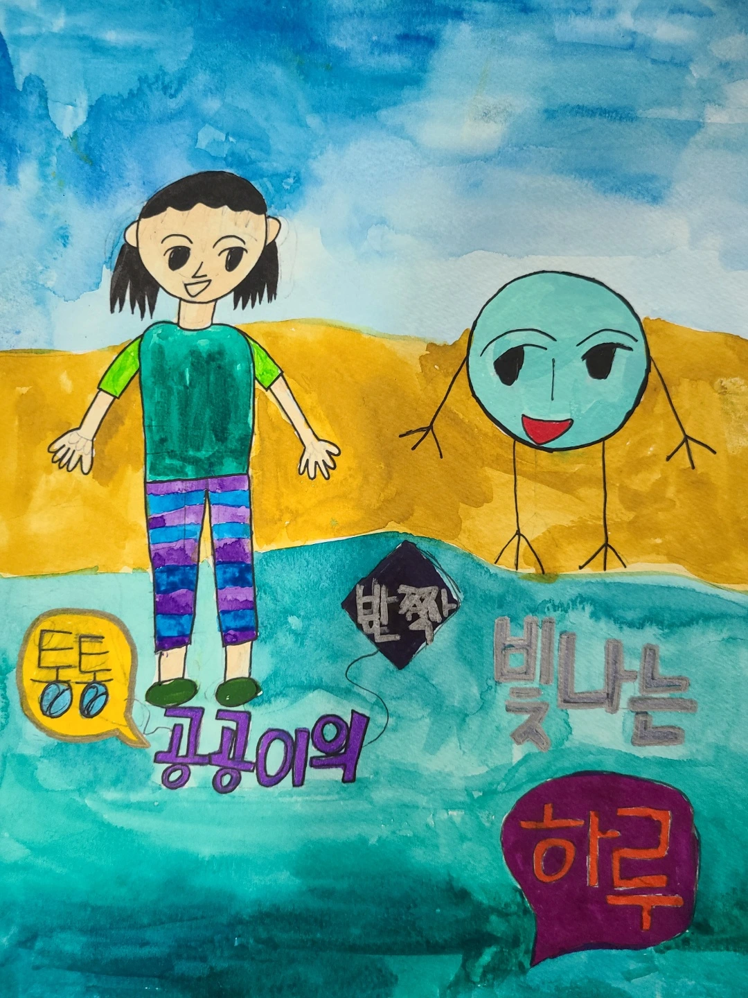 아이는 들은 이야기 속에서 자신이 그리고 싶은 그림을 정성껏 두 장을 그려주었다. 반짝 빛나는 공공이나 된 우리 아이, 실 생활에서도 공공이 엄마처럼 그렇게 말해주고 기다려줄 걸 그랬다는 마음과 이렇게라도 아이에게 위로가 되었기를 바라는 마음이 포개진다. 이야기 속 공공 이를 믿어주고 공공이가 빛났 듯, 나의 아이 역시 자신의 강한 색들을 아름답게 뿜어내어 융화시킬 것이라고 믿는다. 이야기를 쓸 때의 마음이 퇴색할 때면 다시 꺼내 읽는다.
