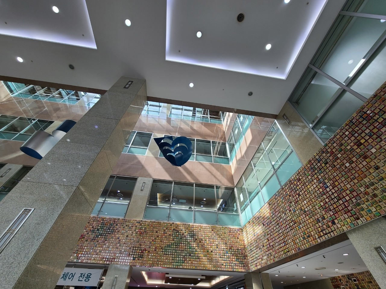 햇살에 벽이 반짝인다. 순간 발견한 것은 하트 모양의 그림자. 그동안은 보이지 않던 것들이 보이는 순간이 존재한다. 저만치 하늘 위에 달린 조형물이 내는 그림자가 하트 모양이라는 사실, 그 햇빛이 닿아 반짝이는 곳에는 어린이들이 그린 수많은 타일이 존재한다는 사실, 대학병원 내 어린이 병원에서 올려다본 천장은 이러한 모습이었다.