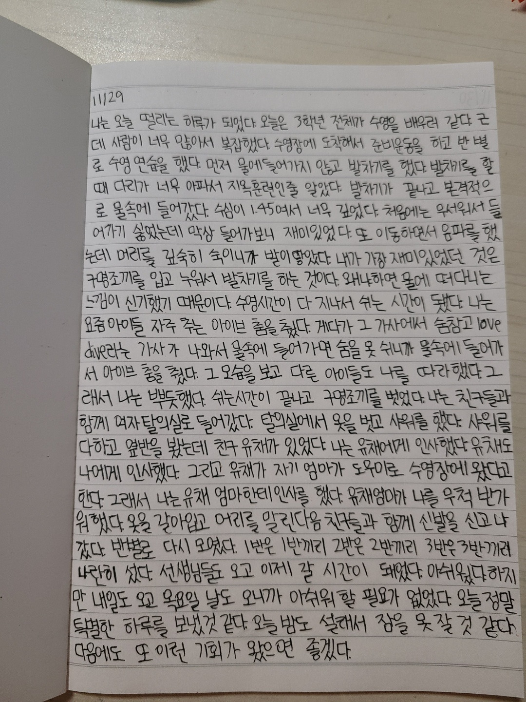 초등학교 3학년 첫째의 일기를 몰래 엿보며.. 나는 아이가 환히 웃으며 임했을 그날을 아이 글씨로 된 행간을 더듬으며 그려볼 뿐이다.